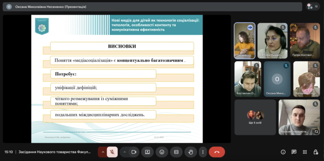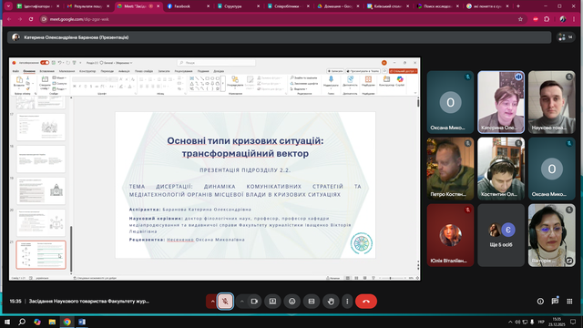 23 грудня 2025 року відбулося чергове засідання Наукового товариства Факультету журналістики. Захід уже не вперше проходив у форматі наукової апробації, що дає змогу аспірантам системно представляти результати власних досліджень, отримувати фахові рекомендації від рецензентів, аргументовано відстоювати свої наукові позиції та брати участь у змістовній науковій дискусії.
