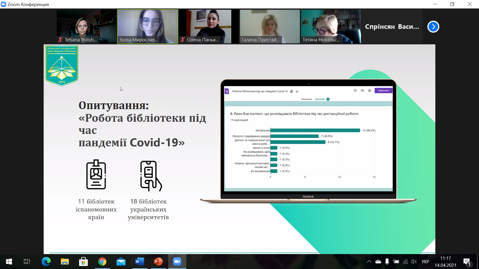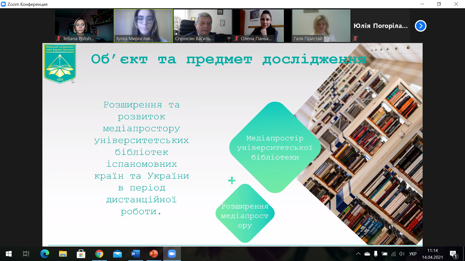 Студентка ІV курсу освітньої програми «Інформаційна, бібліотечна та архівна справа» Інституту журналістики Київського університету імені Бориса Грінченка Зуєва Мирослава Олександрівнапосіла ІІ місце, представивши наукове дослідження «Розширення медіапростору університетських бібліотек в період пандемії Covid-19». Науковий керівник – старший викладач кафедри бібліотекознавства та інформології Поліщук Т.І.