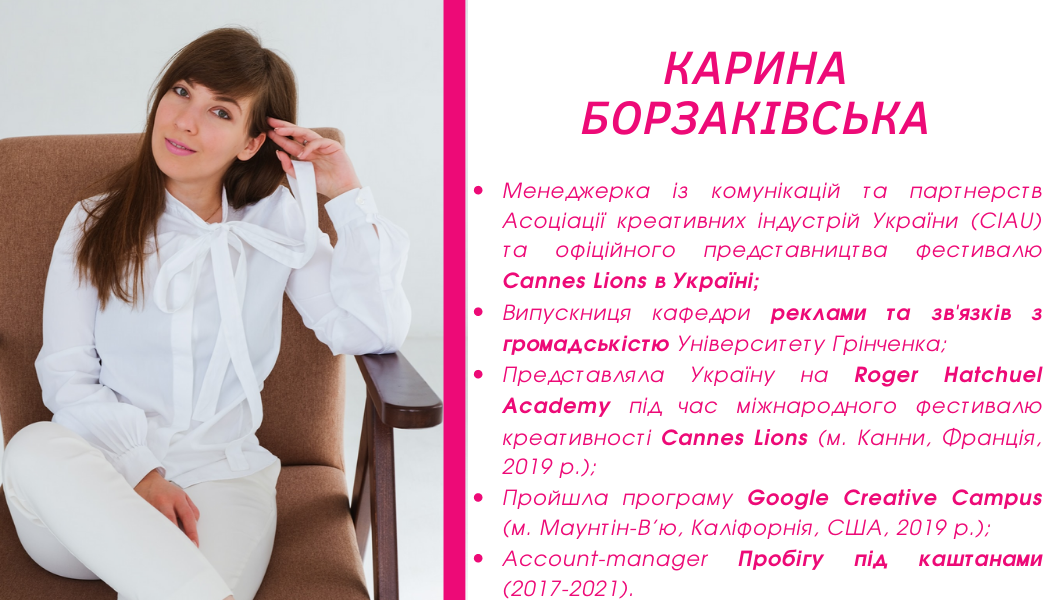 Майстер-клас для юних рекламістів провела Карина Борзаківська, випускниця кафедри реклами та зв’язків з громадськістю Університету Грінченка (2019 р.), менеджерка з комунікацій та партнерств офіційного представництва фестивалю Cannes Lions в Україні та Асоціації креативних індустрій України (CIAU). Крім захоплюючих розповідей про кейси, міжнародні проєкти та масштабні рекламні кампанії, пані Карина також розповіла студентам про musthave сучасного рекламіста та піарника. Першокурсники ставили багато запитань Карині щодо самореалізації себе в цій сфері та отримали низку порад про те, як бути конкурентоспроможним фахівцем на ринку.