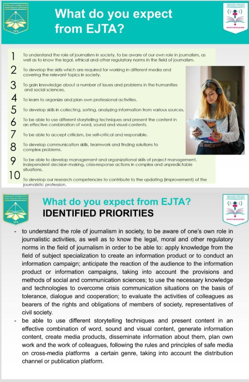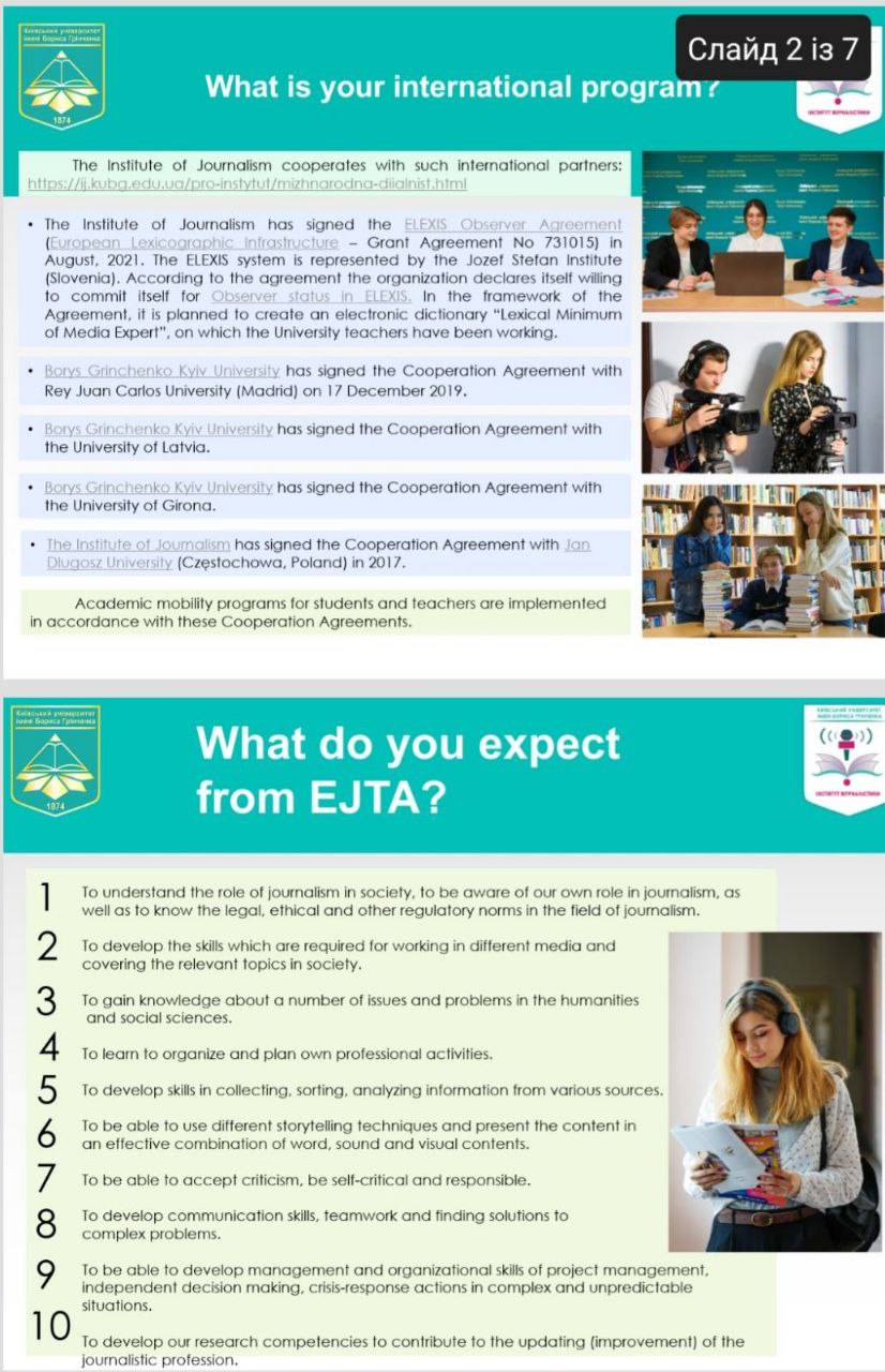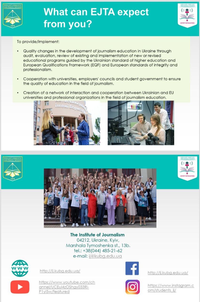 Пані Ольга та пані Олександра ознайомили присутніх із діяльністю Інституту журналістики, після чого члени правління Асоціації проголосували одноголосно за доєднання Київського університету імені Бориса Грінченка до світової журналістської спільноти. Європейська асоціація була створена в Брюсселі в 1990 році. Вона об'єднує близько 70 журналістських центрів, шкіл та університетів із понад 30 країн Європи. Будучи членом EJTA, Інститут журналістики має ще більші можливості міжнародної діяльності: може просувати свої програми та мати повний доступ до каталогу мобільності EJTA; члени Асоціації отримують інформаційний бюлетень EJTA з інформацією про Асоціацію та її школи-членів та нові розробки в галузі журналістської освіти; пропонується приєднання до EJTA AGM та щорічної конференції, конференції вчителів, двох щомісячних онлайн-EJTAlks, зустрічей про впровадження неформальної освіти та найкращих практичних сесій; члени Асоціації можуть скористатися інформацією, досвідом та можливою участю в проектах, що фінансуються ЄС; можуть брати активну участь у EUfactcheck, проекті перевірки фактів EJTA, використовувати його навчальний матеріал та мати студентів публікувати на www.eufactcheck.eu; члени асоціації можуть розвивати контакти для сприяння обміну викладачами та студентами та мати доступ до бази даних в організації обмінів та інших проектів, включаючи дослідження; члени можуть, з метою співпраці в галузі досліджень або при пошуку спікерів, знайти експертів у конкретних областях на базі даних експертів EJTA LinkedIn. члени представлені виконавчою радою асоціації; Асоціація захищає інтереси членів в європейських інституціях, міжнародних організаціях та професійних асоціаціях; члени мають можливість брати участь у спільних дебатах з важливих питань/проблем журналістики та навчання журналістики.