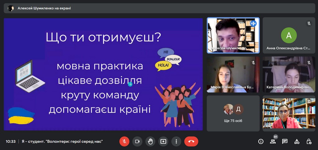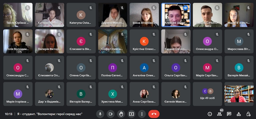Напередодні Дня Університету Грінченка студенти-першокурсники освітньої програми «Реклама та зв’язки з громадськістю з гостями говорили про волонтерів та напрями їх роботи. Студенти поділилися власними прикладами волонтерства, що захопило їх ще зі шкільної парти, а нині вони усвідомлюють важливість такої діяльності для усіх. На зустрічі з першокурсниками гості ділилися проявом небайдужості до долі ближніх, до важливості прояву активної громадянської позиції для розбудови України.