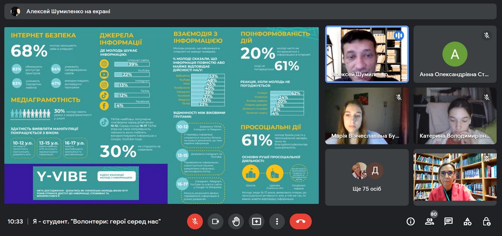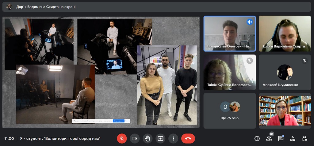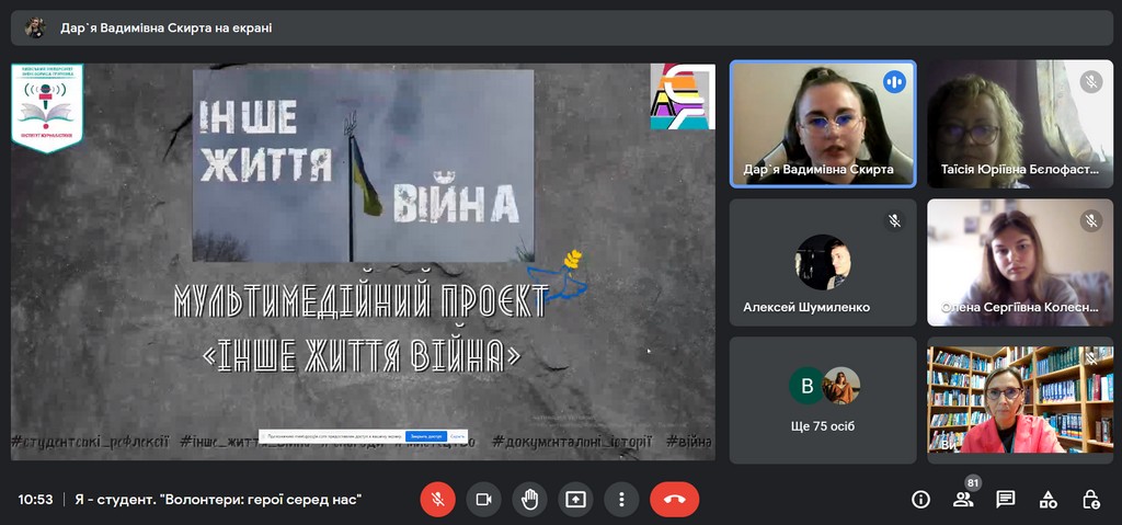 Дар'я Скирта та Владислав Нестеров подідилися досвідом створення та реалізації під час повномасштабного вторгнення важливих проєктів "інше життя війна" під кураторством Аліни Лісневської, доцента кафедри журналістики та "ВОНИ. Грінченківці" в яких розкривають досвід студентів-грінченківців. Це виявилося не просто інформаційне волонтерство, а й повноцінне емоційне волонтерство та підтримка студентів у важкі часи. Команда Астудії продовжує вчасно реагувати на виклики часу та впевнено тримає інформаційний фронт.