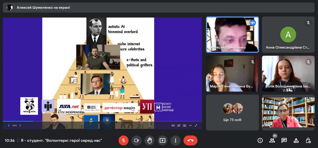 Олексій Шуміленко, член благодійного фонду «Солом’янські котики», інформаційний волонтер, керівник медіагуртка в КПДЮ, поділився надбаннями та досягненнями команди, що забезпечує інформаційну підтримку новин та фільтрування дописів про Україну, моніторинг західних медіа на рахунок поширення ними достовірної інформацію про події в Україні. Важливим моментом такого волонтерства, наголосив Олексій, є співпраця української інфоспільноти та викриття неточностей трактування подій в Україні, через поширені росією наративи.