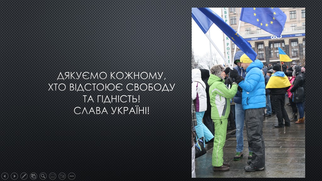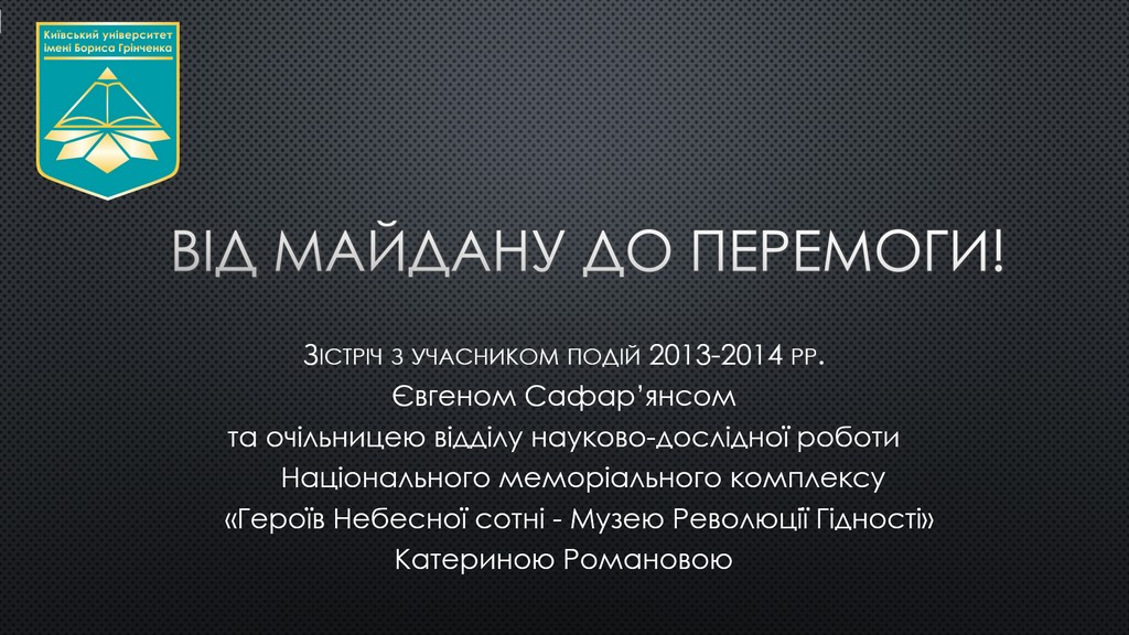 Про свій досвід перебування на студентському Євромайдані, восени 2013 року з першокурсниками поділився пан Євгеній. Він розповів, що одразу після відмови уряду Азарова від руху в бік євроінтеграції та оголошення про зустріч під Стелою Незалежності 21листопада 2013 року був серед молоді, що обурилася таким рішенням. Частина молоді, що вийшла у той вечір на площу, розійшлася, а частина залишилася відстоювати право України на шлях повернення до Європи. Усі очікували, що 28-29 листопада на зустрічі з представниками Євросоюзу договір про тісну співпрацю та євроінтеграцію таки буде підписано, та цього так і не сталося в ті дні. Тоді влада України відповіла протестувальникам жорстким розгоном у ніч з 29 на 30 листопада. А вже 1 грудня 2013 р. у Києві на Майдан вийшов понад 1 мільйон людей. Так почалася Революція Гідності. На ранок 1 грудня ми усі побачили звернення нашого ректорату з висловленням протесту проти таких дій влади. Це було надзвичайно важливо для кожного з грінченківців – знати, що колектив університету на боці справедливості. Євгеній Сафар’янс наголосив на тому, що молоді вкрай важливо відсоювати свою гідність та боротися за власне майбутнє.