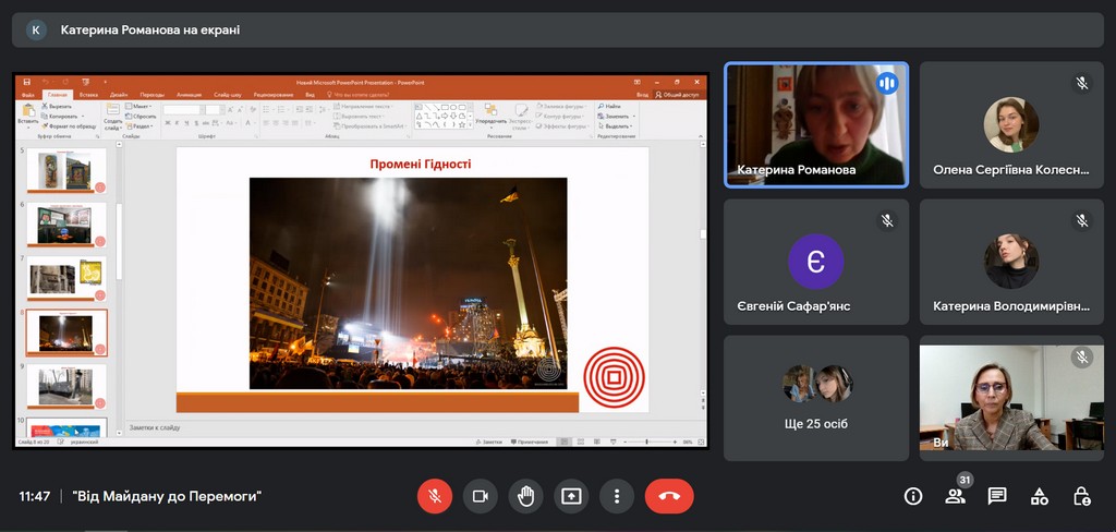 22 листопада 2022 року студенти першого курсу Факультету журналістики зустрілися з учасниками Євромайдану та Революції Гідності: Євгеном Сафар’янсом, кандидатом історичних наук, заступником директора КЗ «Музей Вінниці» та Катериною Романовою, очільницею відділу науково-дослідної роботи Національного меморіального комплексу Героїв Небесної сотні – Музей Революції Гідності.
