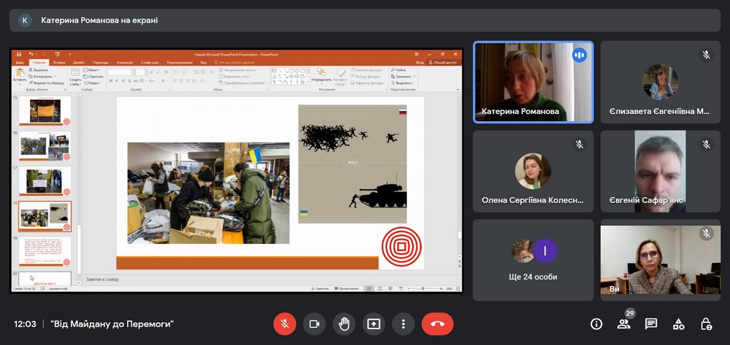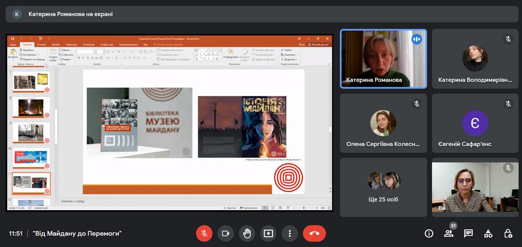 Катерина Романова представила концепцію створення майбутнього меморіального комплексу «Героїв Небесної сотні – Музей Революції Гідності». Вона розповіла скільки дослідницьких матеріалів було зібрано за ці роки: фото та відео документи, особисті та загальні речі майданівців, проведено записи інтерв’ю з учасниками тих подій. Наголосила на тому, що головними перевагами Майдану були - самоорганізація, волонтерська підтримка усіх починань, віра у перемогу народу. Також пані Катерина зазначила, що повномасштабне вторгнення російських військ в Україну, 24 лютого цього року, позначилося і на роботі їх музею, адже значна кількість учасників Революції Гідності нині захищає Україну, а цьогорічне гасло «Вистояли на Майдані – переможемо у війні!» як ніколи відповідає здобуткам українського народу та ЗСУ.