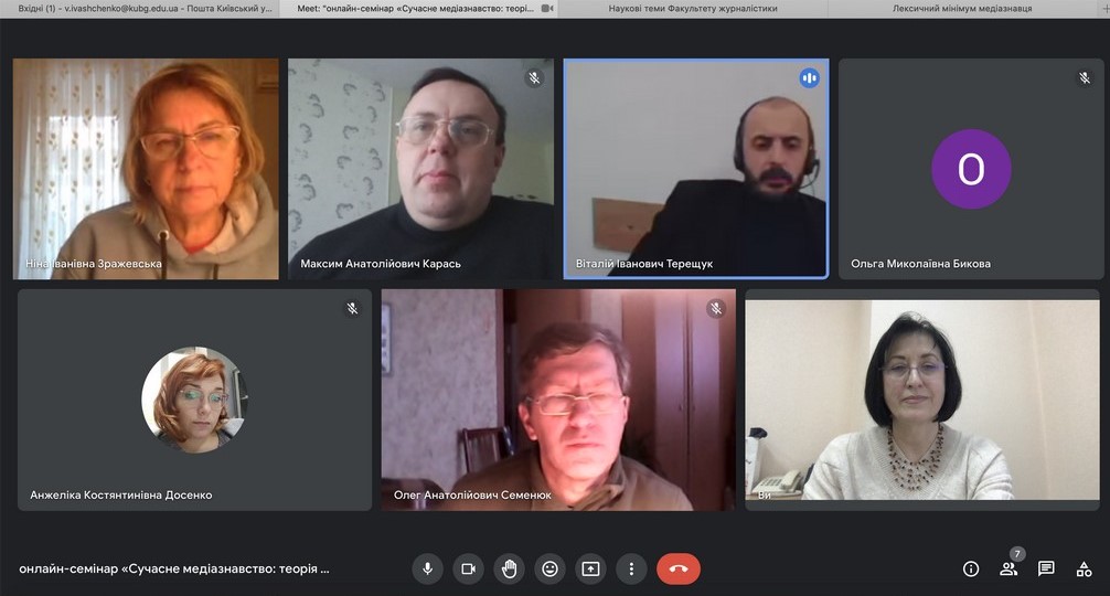 6 лютого 2023 року за участі викладачів кафедри міжнародної журналістики (докт. політ. наук В.І. Терещука, докт. наук із соц. комунікацій Н.І. Зражевської, докт. філол. наук О.А. Семенюка, канд. наук із соціальних комунікацій О.М. Бикової, канд. наук із соціальних комунікацій А.К. Досенко, канд. філол. наук М.А. Карася) відбувся науково-практичний семінар «Сучасне медіазнавство: теорія і практика» (модератор – заступник декана ФЖ із наукової роботи, докт. філол. наук В.Л. Іващенко), на якому обговорювалися такі питання: