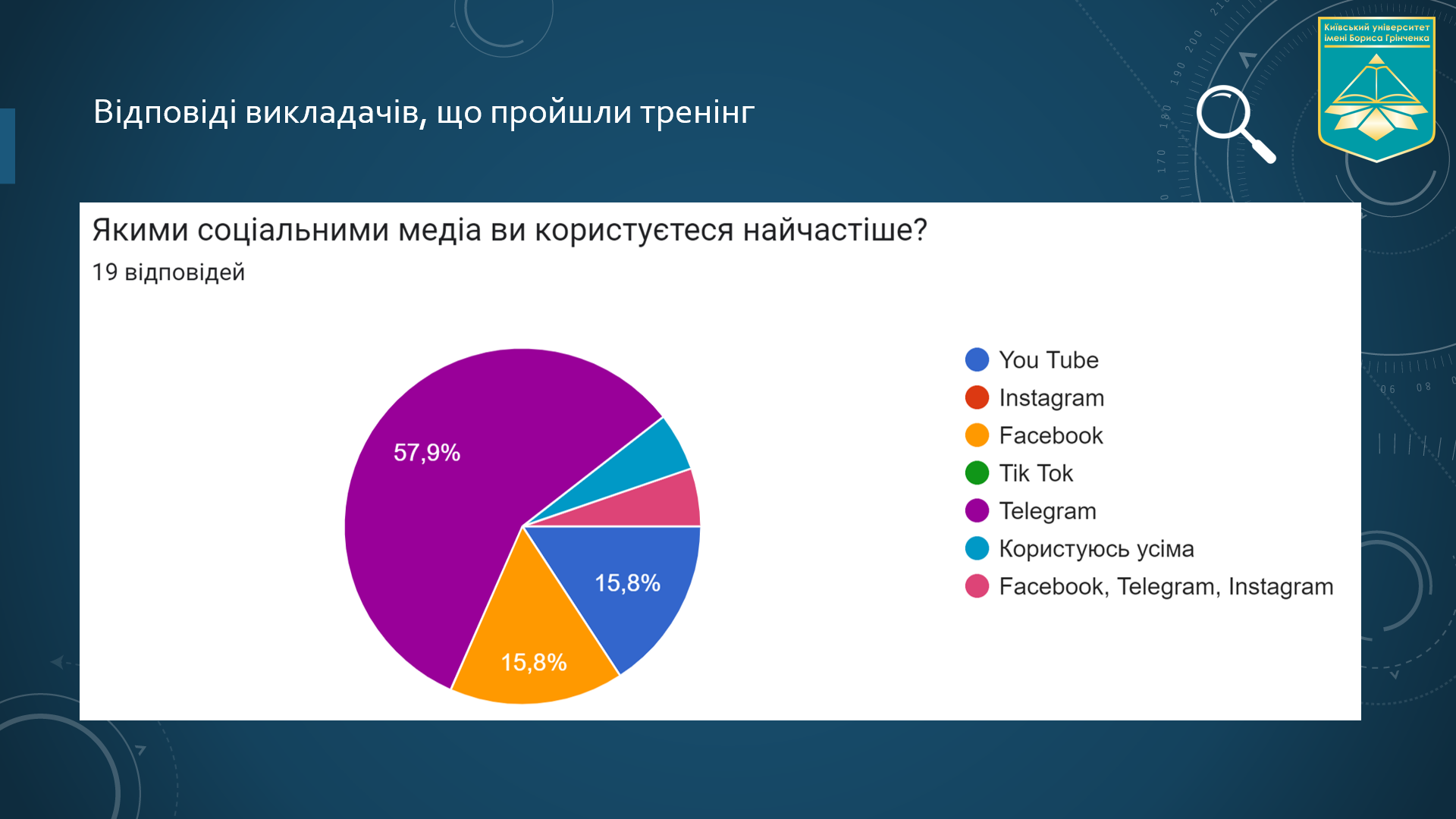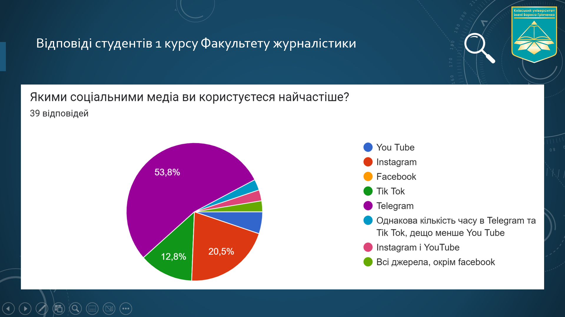 Тетяна Поліщук представила результати опитування студентів 1 курсу Факультету журналістики, в якому одним із запитань було «Якими соціальними медіа ви користуєтеся найчастіше?». Під кінець зустрічі на таке ж питання відповіли і колеги-учасники вебінару. У обох категоріях опитуваних лідером стала мережа Telegram.