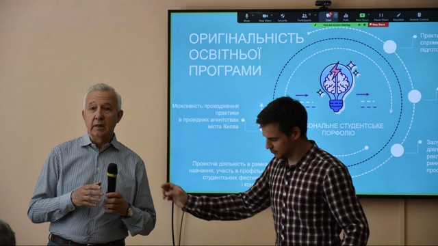 Практико-орієнтованим є навчання за спеціальністю «Реклама і зв’яки з громадськістю», приклади проєктів успішних випускників навів Леонід Новохатько, завідувач кафедри. Він наголосив на важливості підсилювати певні знання, що допоможуть бути успішним у професії та навів приклади реалізованих студентами кейсів.