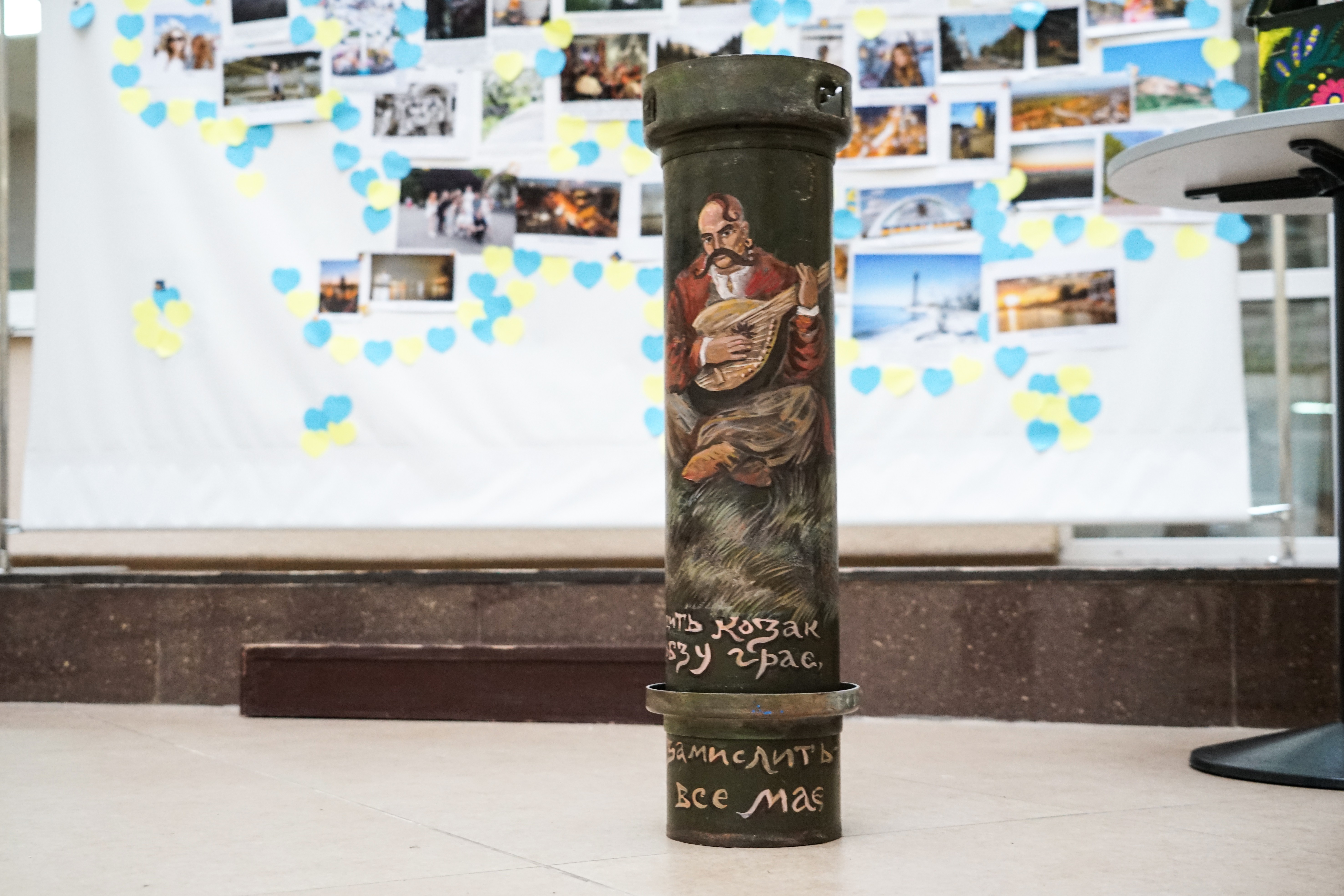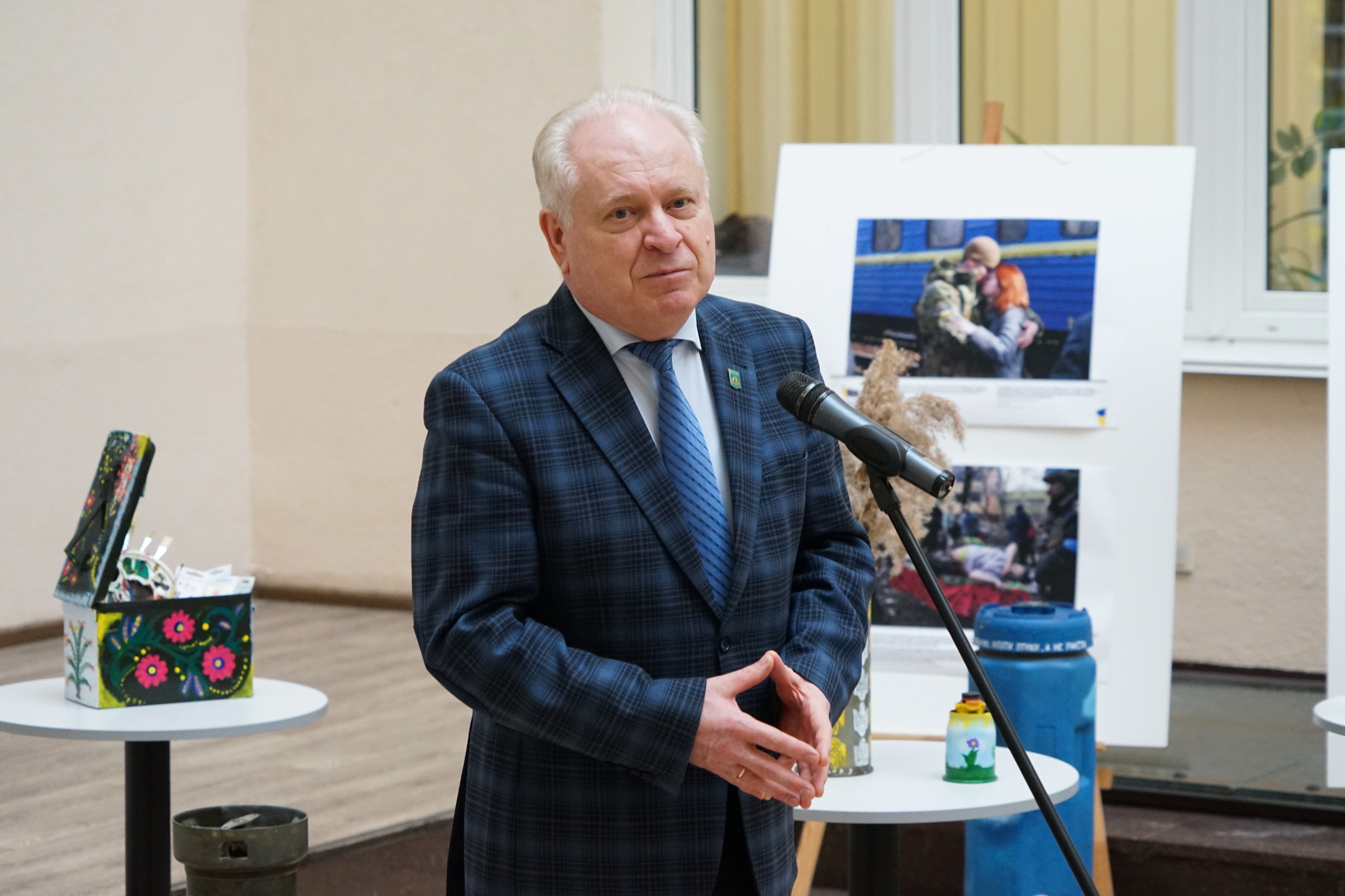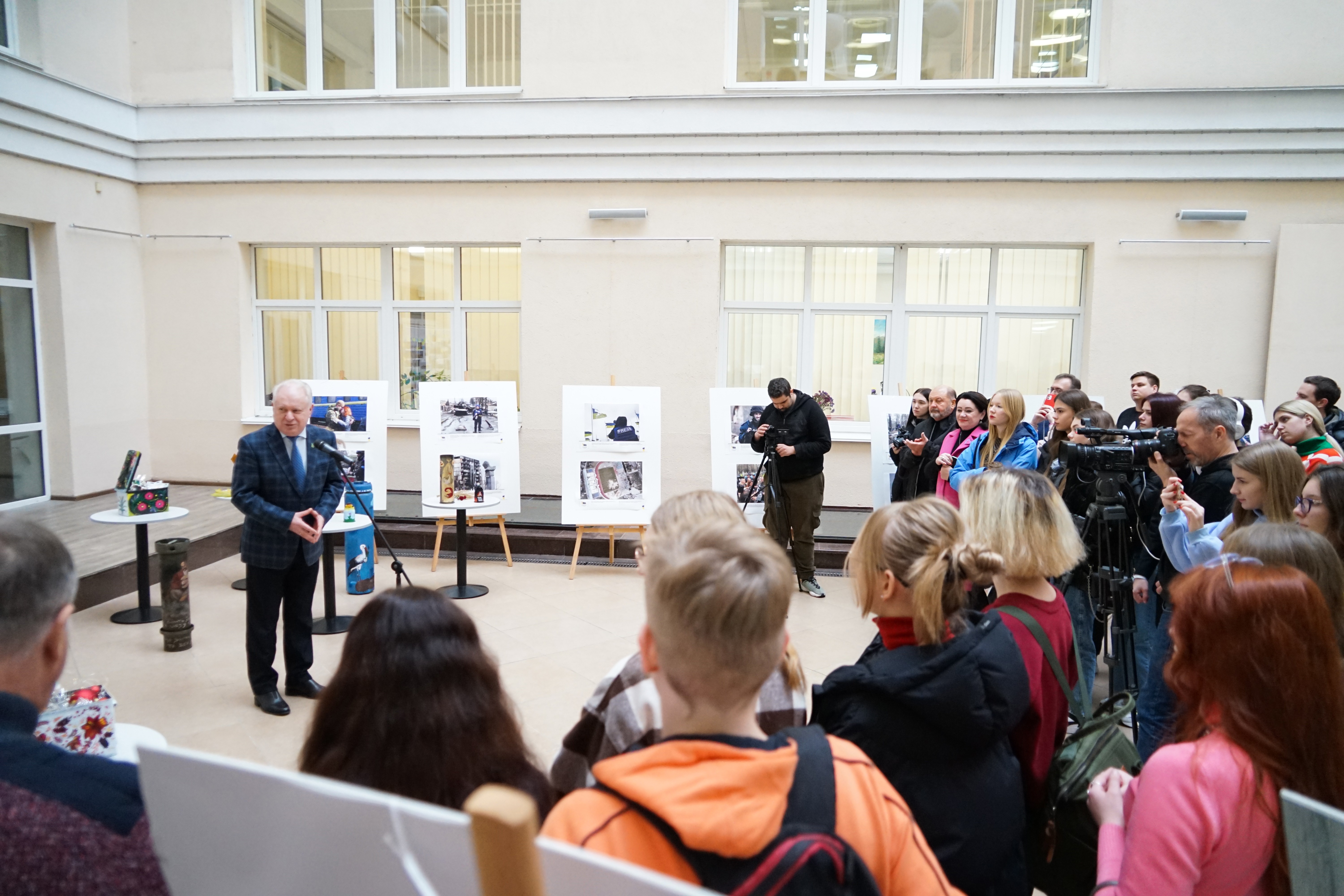 З вітальною промовою до студентів звернувся проректор Київського університету імені Бориса Грінченка Олександр Петрович Турунцев. Він зазначив, що такі ініціативи важливі, а виставка, презентована сьогодні дуже символічна. «Це зброя перетворена в мистецтво», - зауважив Олександр Петрович.