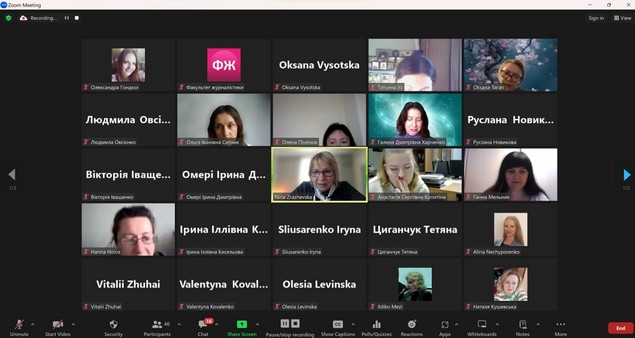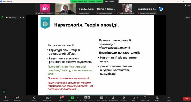 Ко-тренеркою першого навчального дня курсу також була Ніна Зражевська, професорка кафедри міжнародної журналістики, доктор наук із соціальних комунікацій, яка провела вебінар на тему «Наративний аналіз текстів медіакультури».