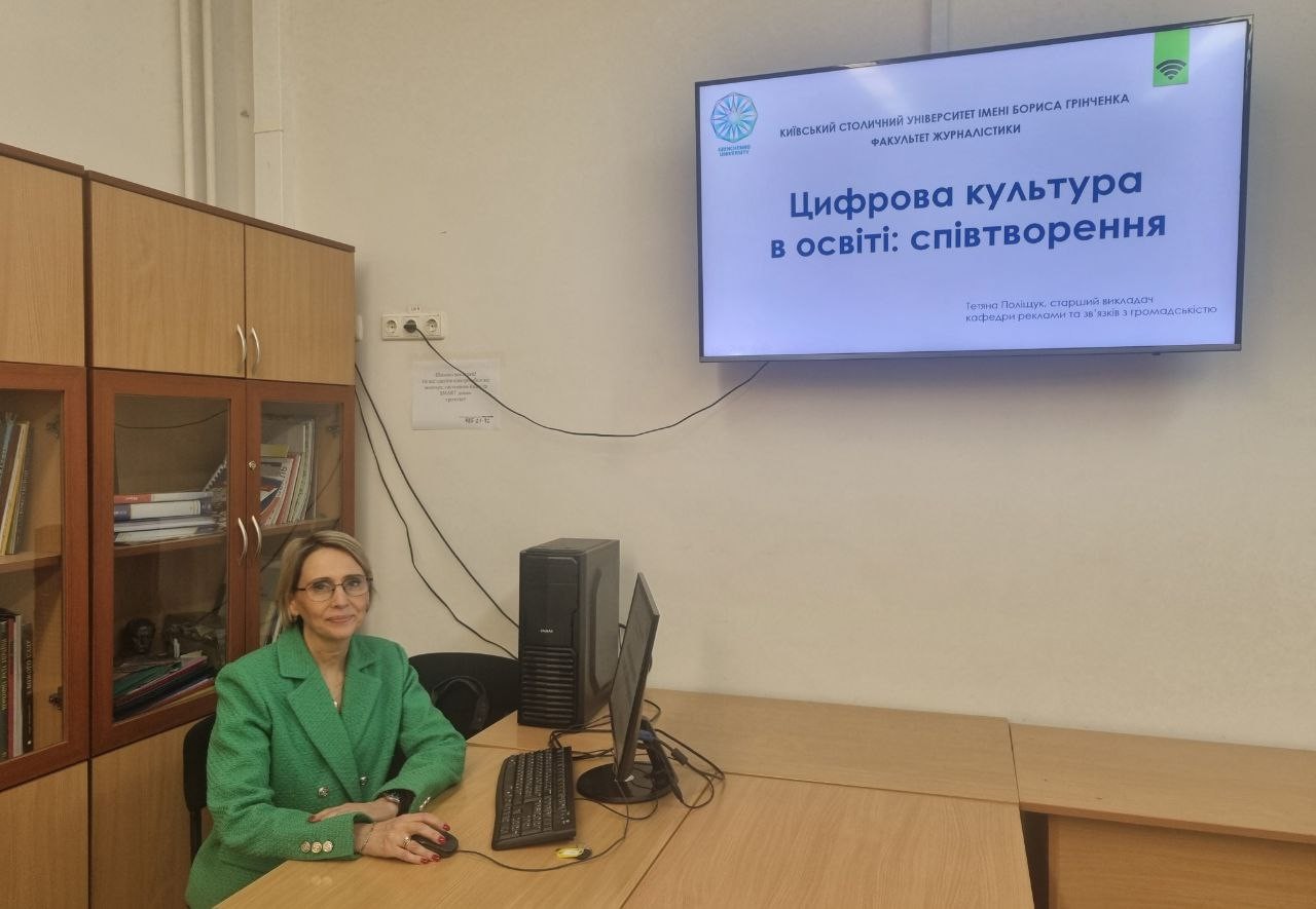 Тетяна Поліщук, старший викладач кафедри реклами та зв'язків з громадськістю з темою "Цифрова культура в освіті: співтворення". Розповіла про цифровізацію освіти та науки, як систему заходів, впровадження інноваційних елементів, відхід від традиційної структури закладів вищої освіти до цифрових та віртуальних платформ та сервіси для дистанційного навчання і творчості. Лекторку асистувала здобувачка 3 курсу, рівня вищої освіти першого (бакалаврського) ОП "Видавнича справа та редагування" Поліна Кирієнко й допомагала викладачам ознайомлюватися з онлайн-редактором.