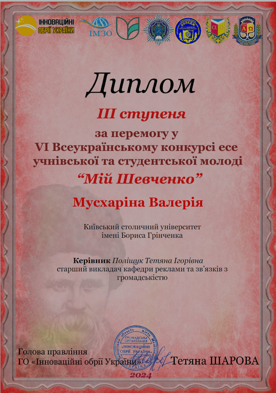 Вітаємо студентку ІІ курсу рівня вищої освіти першого (бакалаврського), ОП «Журналістика» Валерію Мусхаріну перемогою та Дипломом ІІІ (назва есе «Шевченківська стежина»).
