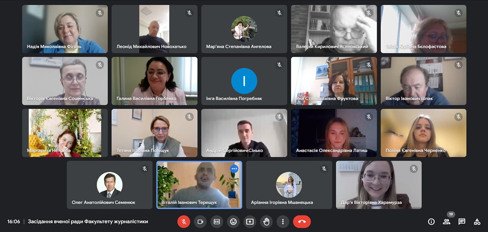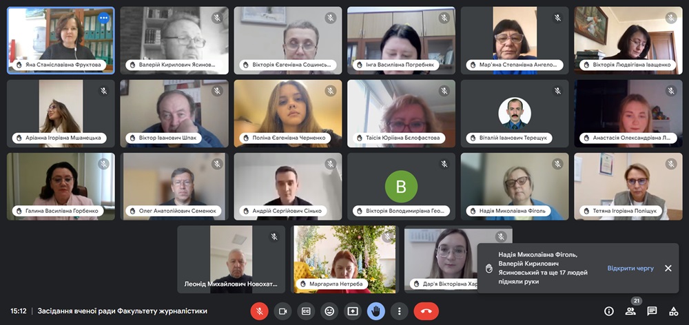 Відбулось засідання Вченої ради Факультету журналістики Київського столичного університету імені Бориса Грінченка в якому взяли участь 21 представник з числа науково-педагогічних працівників та здобувачів вищої освіти. Засідання розпочала Голова зборів трудового колективу Факультету журналістики, кандидат педагогічних наук, доцент Яна Фруктова, яка запропонувала відкритим голосуванням обрати лічильну комісію та секретаря Вченої ради.