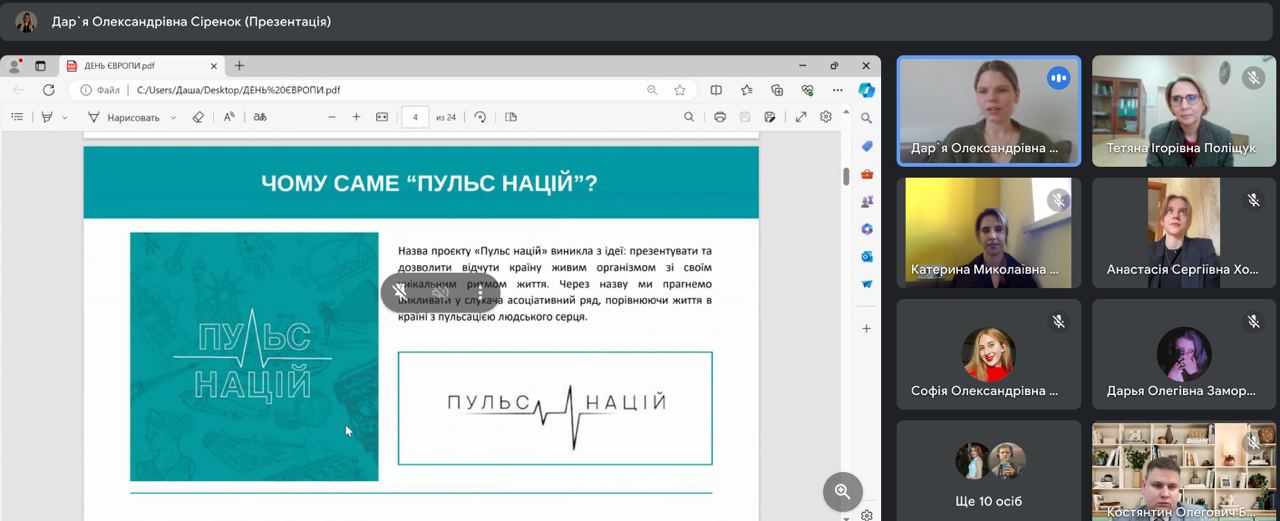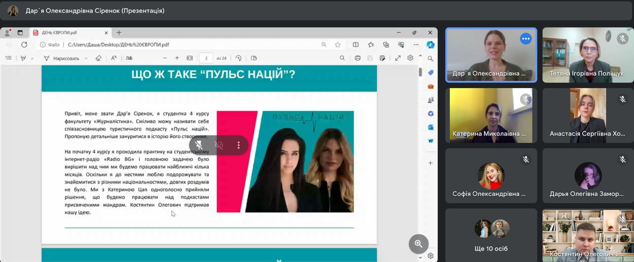9 травня 2024 року в Україні відзначають День Європи. Це свято Україна вже вдруге відзначає на державному рівні, а на Факультеті журналістики відбувся цікавий тематичний захід. Під час зустрічі зі студентками 4 курсу ОП "Журналістики" Катериною Цап, Дарʼєю Сіренок та Анастасією Хоменко був представлений авторський проєкт — туристичний подкаст "Пульс націй", розроблений у співпраці зі студентським інтернет-радіо "Радіо BG". Гості зустрічі, студенти 2 курсу ОП "Реклама і зв'язки з громадськістю", дізналися історію створення проєкту, зазирнули за завісу роботи на радіо, а також послухали про особливість та важливість висвітлювання туристичних подорожей до країн Європи.