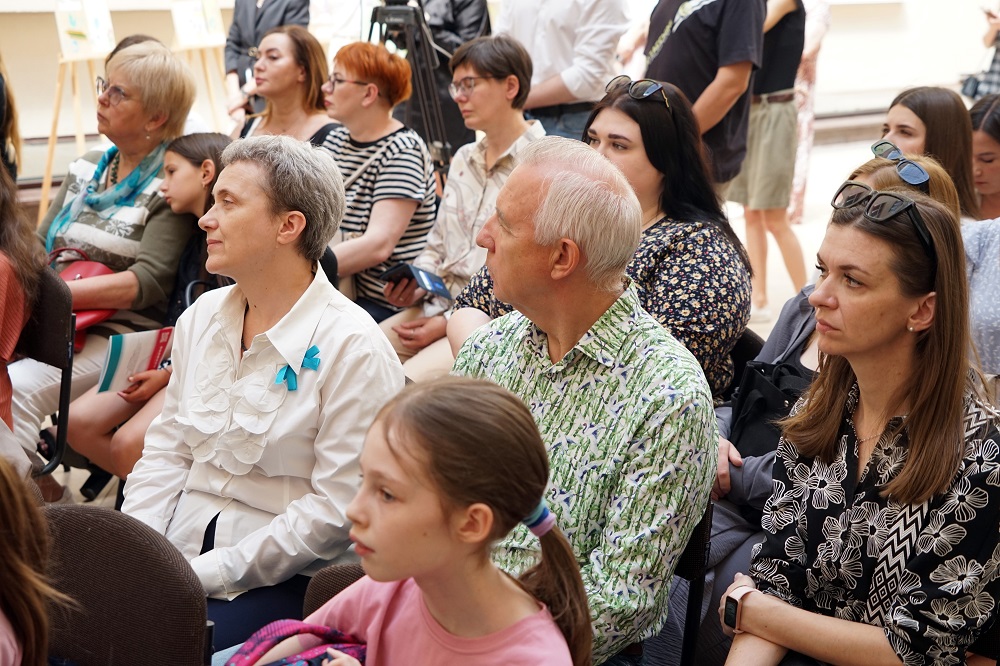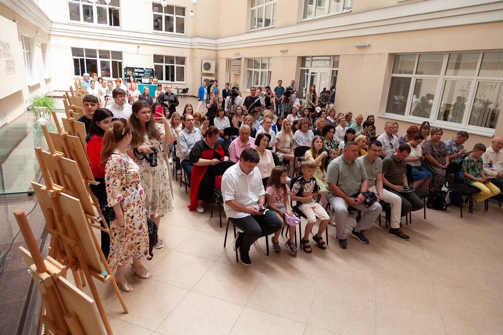 Анатолій Анатоліч (ведучий, автор блогу на ютуб-каналі) розповів як його діти долучилися до акції та залюбки малювали тата на роботі. Перший день після звільнення від окупації» та «Інтерв'ю з героєм ЗСУ» - так донечки Анатолія Анатоліча назвали свої роботи. Як і всі українські діти, вони з нетерпінням чекають переможного миру в нашій країні. Ще один ведучий, Анатолій Ковальський, відвідав виставку разом зі своїми дітьми. Творча акція дитячого малюнку розпочалася у травні цього року за ініціативи Національної спілки журналістів України. Діти з різних куточків нашої держави надсилали поштою малюнки до Київського Центру журналістської солідарності, що відкрився на початку повномасштабного вторгнення. А ось родина телеведучого Андрія Ковальського у повному складі відвідала такий центр та першою принесла малюнки. «Журналісти - важливі», так назвали діти свої роботи, ознайомившись із діяльністю Центру солідарності. Запрошуємо на сцену пана Андрія з дружиною Тетяною та їх діточок -8-річного Назара та 6-річну Полінку.