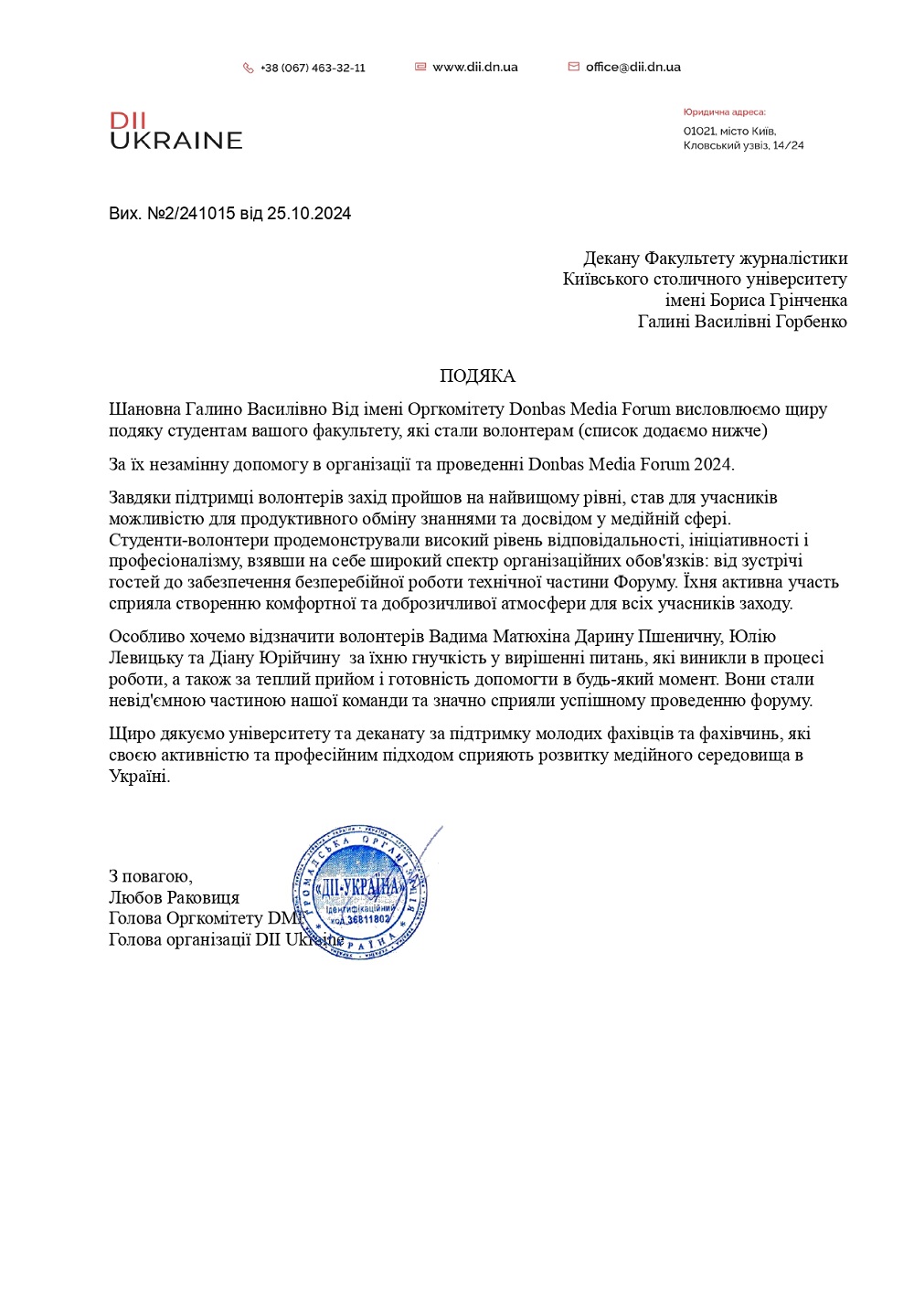 Від імені Оргкомітету Donbas Media Forum висловлюємо щиру подяку студентам вашого факультету, які стали волонтерам (список в прикріпленому файлі).