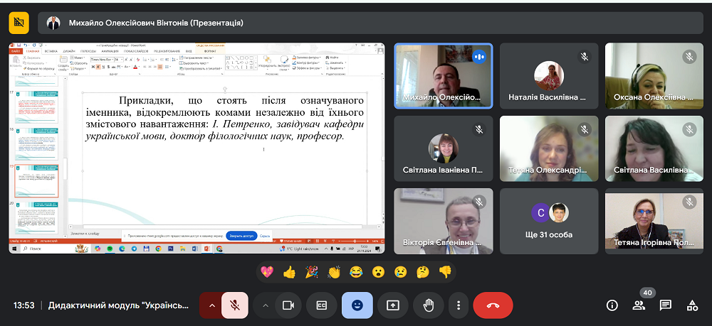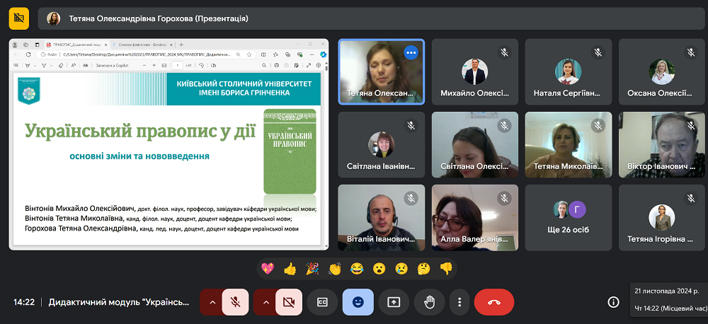 21 листопада 2024 року 13 науково-педагогічних працівники Факультету журналістики доєдналися до вивчення змін та нововведень українського правопису. Під час занять Михайло Вінтонів, завідувач кафедри української мови, доктор філологічних наук, професор розповів про розвиток українського правопису та важливі історичні моменти й особистості, що вплину на ці зміни. Слухачам було запропоновано кілька мовних вправ, щоб вони могли потренуватися у введених змінах. Важливим моментом, на який радив звертати увагу Михайло Олексійович було зауваження, що варто спробувати говорити за новим правописом й повторене кілька разів стає звичкою.