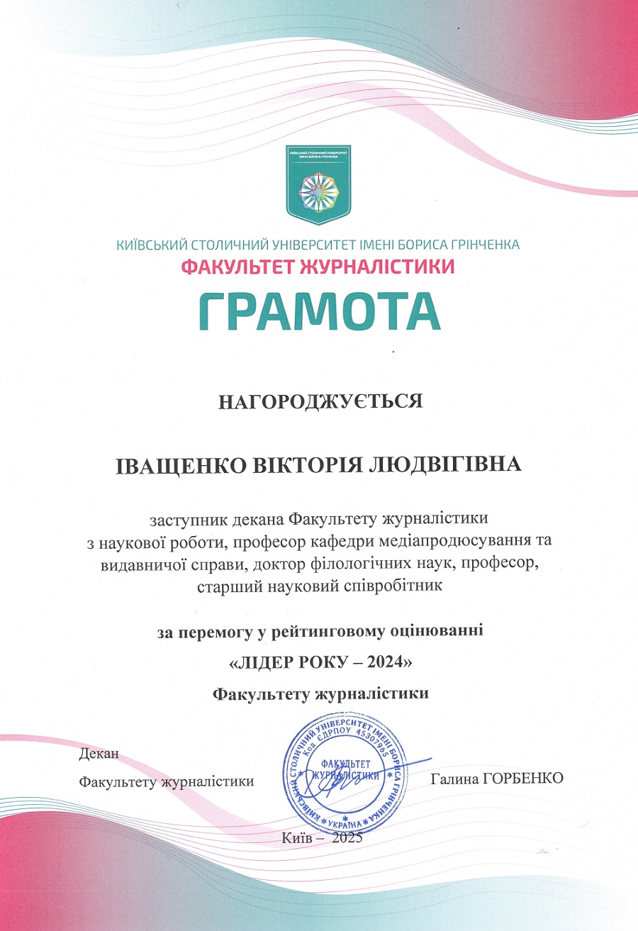 Іващенко Вікторія Людвігівна, заступник декана Факультету журналістики з наукової роботи, професор кафедри медіапродюсування та видавничої справи, доктор філологічних наук, професор.