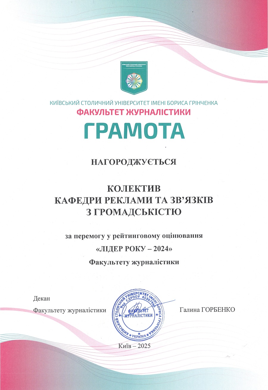 Лідером серед структурних підрозділів Факультету журналістики стала кафедра реклами та зв’язків з громадськістю.