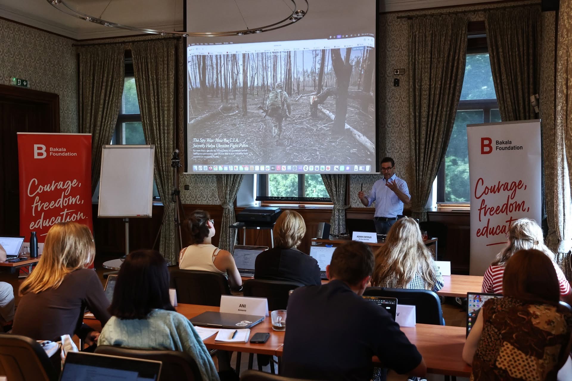 Journey: Journalism Bootcamp — це щорічний 10-денний інтенсив, який об’єднує молодих журналістів з усього світу. Цьогоріч учасниками програми стали 20 молодих медійників із України, Хорватії, Польщі, Чехії, Сербії, США та Британії. Програма поєднує інтерактивні семінари, польові завдання та симуляції роботи у ньюзрумі. Стипендіатів навчають працювати з даними, створювати якісні фото- та відеоматеріали, ретельно перевіряти джерела, робити мультимедійні репортажі та працювати в складних умовах. Заняття проводять журналісти та редактори світового рівня з The New York Times, CNN, Bloomberg, Reuters, Associated Press, а також експерти з University of Cambridge. Вони охоче діляться власним досвідом роботи в міжнародних редакціях, розробкою медійних політик, розслідувальними практиками та реальними журналістськими кейсами. Особливу атмосферу школі додає її локація — історичний маєток Ґребовка у Гавлічкових садах у Празі. Саме тут проживають і працюють стипендіати, поєднуючи інтенсивне навчання з життям у затишному зеленому парку з панорамою міста.