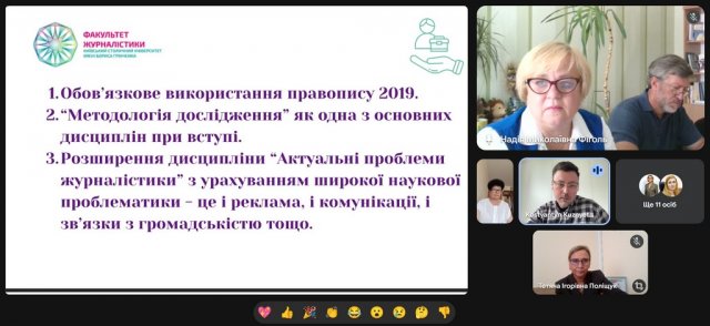 Другим питанням була пропозиція розширення дисципліни «Методологія досліджень соціальних комунікацій», у якому взяли участь Костянтин Кузнєцов та Валерія Касьянчук, кандидат наук із соціальних комунікацій, доцент кафедри видавничої справи та редагування ННВПІ Національного технічного університету України «Київський політехнічний інститут імені Ігоря Сікорського», вони відзначили важливість опанування науковими текстами та методологією дослідження саме для журналістів. Пані Валерія зауважила і щодо викладацької практики для здобувачів. Надія Миколаївна запевнила, що значна частина аспірантів уже працює на бакалаврських ОП.