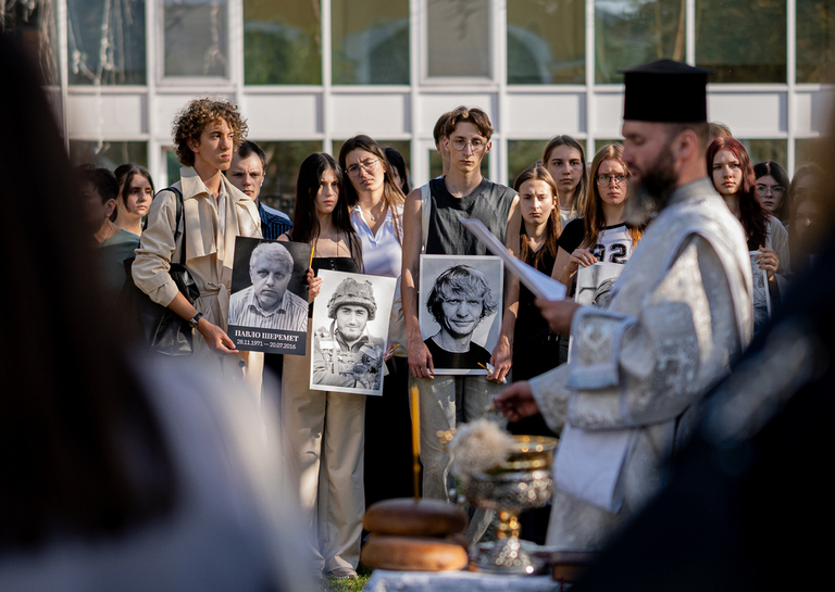 Богослужіння очолив предстоятель ПЦУ, Блаженнійший Митрополит Епіфаній. Упродовж літії настоятель храму Святого Миколи Набережного протоієрей Стефан Яремчук згадав кожну й кожного з журналістів, які загинули з початку незалежності України, зокрема тих, хто віддав життя, доносячи правду про широкомасштабну російську війну. Серед медійників, чиї імена оголосив протоієрей два випускники Факультету журналістики Університету Грінченка - Олександр Кузенков та Олександр Голяченко.