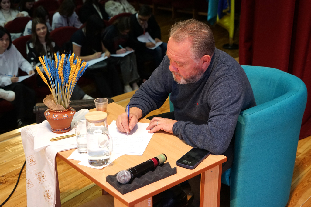 Творча зустріч розпочалася із хвилини мовчання та вдячності Збройним силам України за можливість зібратися в актовій залі та говорити про кіно. Богдан Михайлович познайомив грінченківців зі своєю кар'єрою в кіно, яка розпочалася з кінострічки режисера Леоніда Бикова "Ати-бати йшли солдати". Поділився досвідом роботи з режисерами Литви та Угорщини, представив трейлер нового фільму "Мій карпатський дідусь". Під час відвертої розмови Богдан Бенюк порадив студентам завжди звертатися до своєї мами, як людини, яка чекає та завжди пишається своєю дитиною.