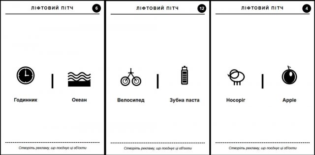 П’ять команд отримали завдання створити рекламну кампанію для несумісних продуктів: годинник + океан, велосипед + зубна паста, носоріг + яблуко. За 5 хвилин підготовки та 1 хвилину презентації студенти продемонстрували ключові компетентності: розробку УТП (унікальної торгової пропозиції), створення нейму та слогану, побудову рекламного сценарію.
