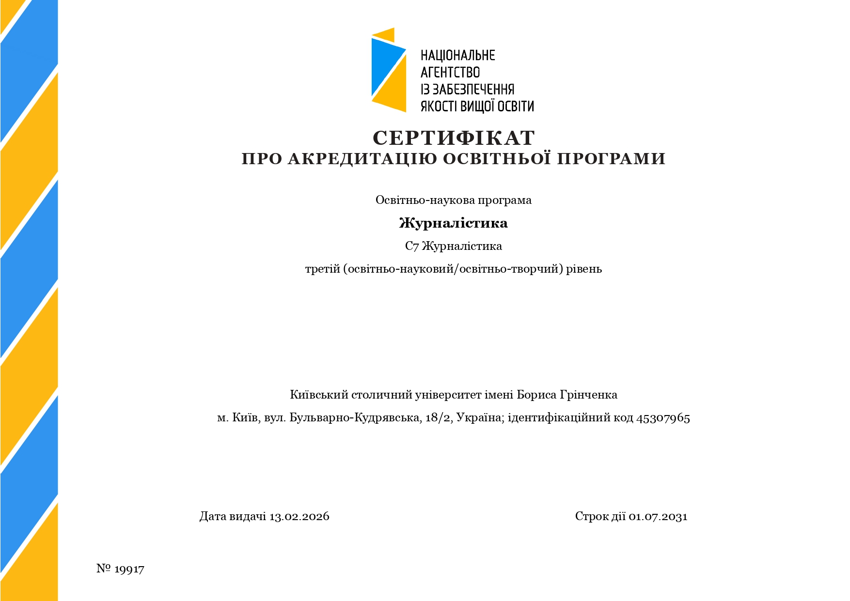 Факультет журналістики Київського столичного університету імені Бориса Грінченка успішно пройшов усі етапи процедури акредитації та отримав сертифікат про акредитацію Національного агентства із забезпечення якості вищої освіти строком на 5 років. Це значне досягнення свідчить про високий рівень підготовки, якість освітнього процесу та відповідність сучасним стандартам, відкриває нові можливості для розвитку української журналістики та підготовки майбутніх науковців.