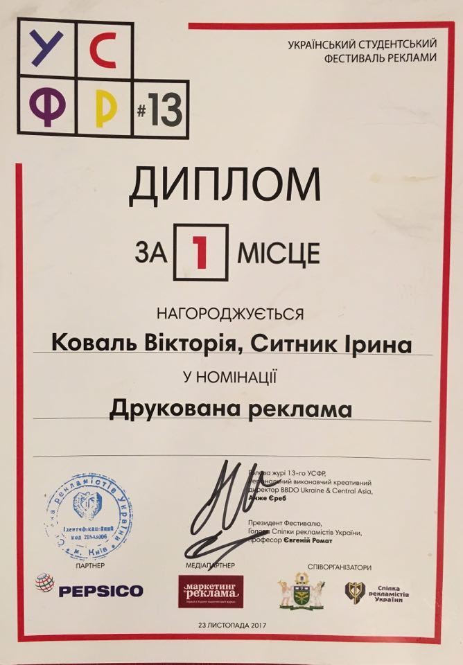 I місце у номінації «Зовнішня реклама», I та III місця у «Друкованій рекламі», а старший викладач кафедри Віктор Шиян – III місце у номінації «Молоді рекламісти».