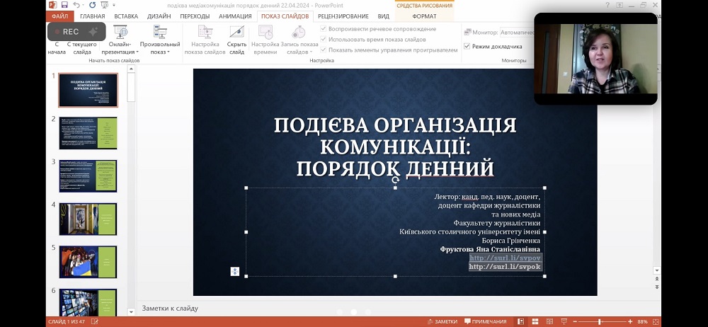 П'ять вечорів насичених тренінгів та практичних кейсів від фахівців у сфері медіа. Перший день розпочався з лекції Яни Фруктової, кандидата педагогічних наук, доцента, доцента кафедри журналістики та нових медіа та котренера Марії Місаїлової (здобувачки 1 курсу магістратури ОП "Медіакомунікації") на тему "Подієва організація комунікації: Порядок денний". Практичною складовою стало представлення успішного медіапроєкту здобувачки 4 курсу освітньої програми "Журналістика" Ксенії Ляпіної — "САЛО НАПИСАЛО".