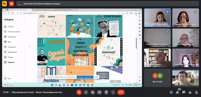 Голова Екзаменаційної комісії Леся Городенко, доктор наук із соціальних комунікацій, доцент, професор кафедри соціальних комунікацій Київського національного університету імені Тараса Шевченка, відзначила актуальність тематики кваліфікаційних робіт (бакалаврських проєктів), її відповідність профілю спеціальності й освітньої програми. Представник роботодавця Антоніна Добровольська, директор ДП «Експрес-об’ява», вражена інноваційністю проєктів, умінням студентів самостійно створювати собі робочі місця. Члени ЕК завідувач кафедри Масімова Лариса, кандидат наук із соціальних комунікацій, доцент, професор кафедри Шпак Віктор, доктор історичних наук, професор, доцент кафедри Осмоловська Олена, кандидат історичних наук, з великою увагою та інтересом поставились до розгляду та оцінки випускних робіт. Усі здобувачі, а їх цьогоріч було 51, успішно захистили свої роботи, що свідчить про високий рівень їхньої теоретико-практичної підготовки та високий фаховий рівень керівників проектів, а також про високий рівень організації процесу захисту робіт.