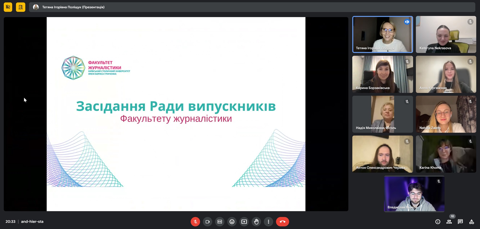 20 березня 2024 року відбулася робоча зустріч представників Ради випускників факультету, модератором якої виступила Тетяна Поліщук, заступник декана з науково-педагогічної та соціально-гуманітарної роботи. Одним з питань було дообрання до складу Ради з-поміж минулорічних випускників рекомендованих кафедрами. Одноголосно були підтримані кандидатури - Сєди Власової, магістра з журналістики, head of creative благодійного фонду savED, головної редакторки науково-популярного видання при Малій академії наук України МАНплатформа та Владислава Власова, магістра з реклами і зв’язків з громадськістю, графічного дизайнера у ТРЦ COSMO MULTIMALL.
