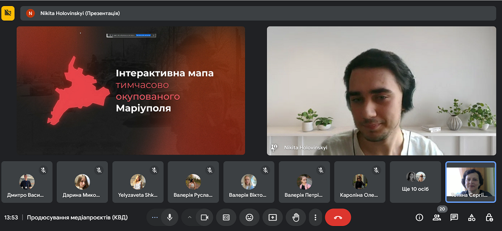 На вебінарі Нікіта розповів про всі етапи створення медіапроєкту, про дослідження ринку і конкурентів, вивчення цільової аудиторії, позиціювання проєкту, його мету, місію, айдентику, збір контенту та його візуалізацію, просування й монетизацію проєкту. Усі ці теоретичні питання були розкриті на прикладі бакалаврського проєкту Нікіти – інтерактивної мапа тимчасово окупованого Маріуполя https://mariupol-war.in.ua/.