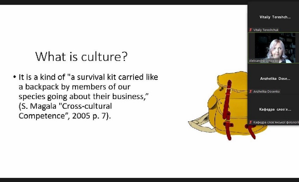 Лекція на тему «Вступ до міжкультурної комунікації» була присвячена питанням культурної та міжкультурної взаємодії, головних аспектів формування комунікативної культури нації сьогодні, змінам у міжкультурних та комунікаційних процесах.
