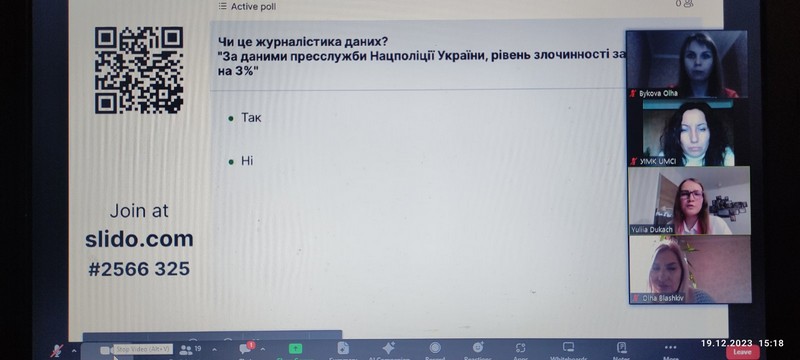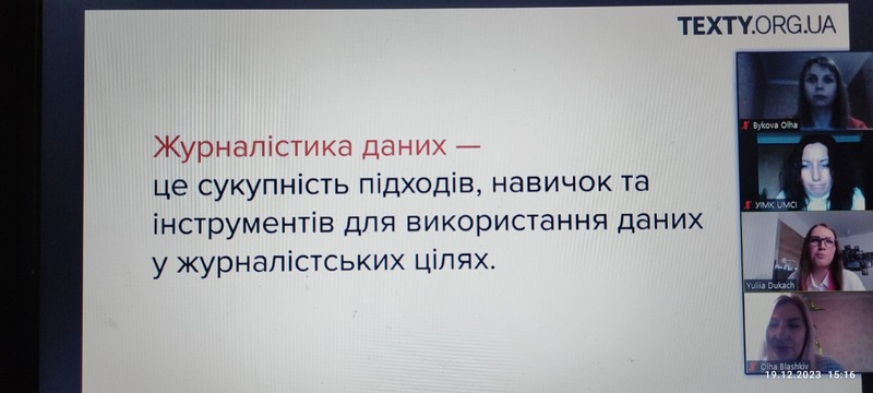 19 грудня 2023 року доцент кафедри міжнародної журналістики Ольга Бикова взяла участь в онлайн-семінарі Юлії Дукач (дата-аналітикині Texty.org.ua та соціологині) на тему «Дата-журналістика: які навички потрібні, щоб створювати історії на основі даних».
