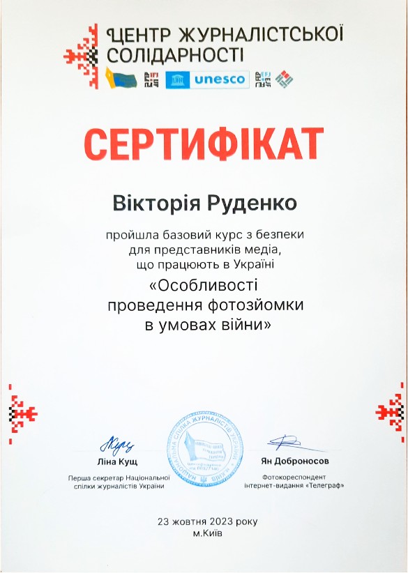 23 жовтня 2023 року здобувачка III курсу освітньої програми «Міжнародна журналістика» Руденко Вікторія РУДЕНКО та здобувач II курсу освітньої програми «Міжнародна журналістика» Андрій ХОДЬКОВ взяли участь у тренінгу «Особливості проведення фотозйомки в умовах війни», який проводила Мережа Центрів журналістської солідарності НСЖУ.