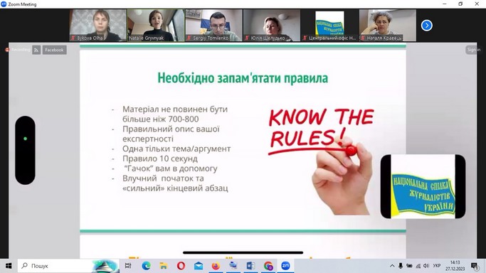 27 грудня 2023 року доцент кафедри міжнародної журналістики Ольга БИКОВА взяла участь у вебінарі «Авторська позиція у журналістиці», організований Національною спілкою журналістів України та організацією N-Ost.