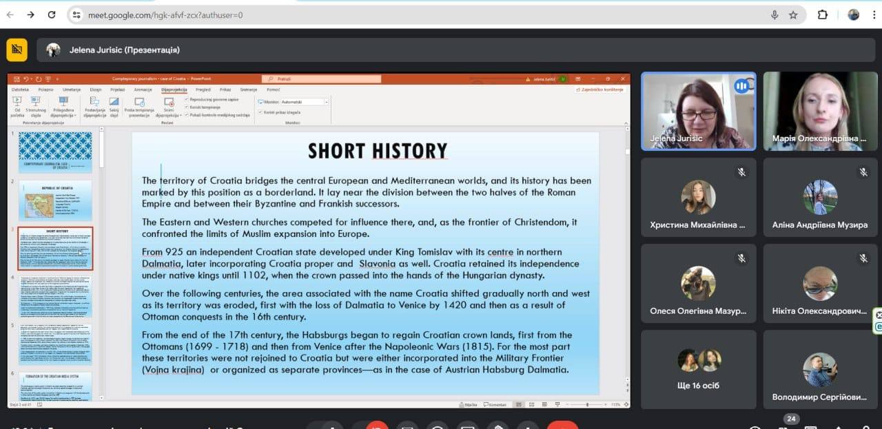 3 травня 2024 року відбулася гостьова лекція Єлени Юришич, професора з комунікацій Сплітського Університету, на тему "Сучасна журналістика: приклад Хорватії" ("Comteporary journalism: case of Croatia").