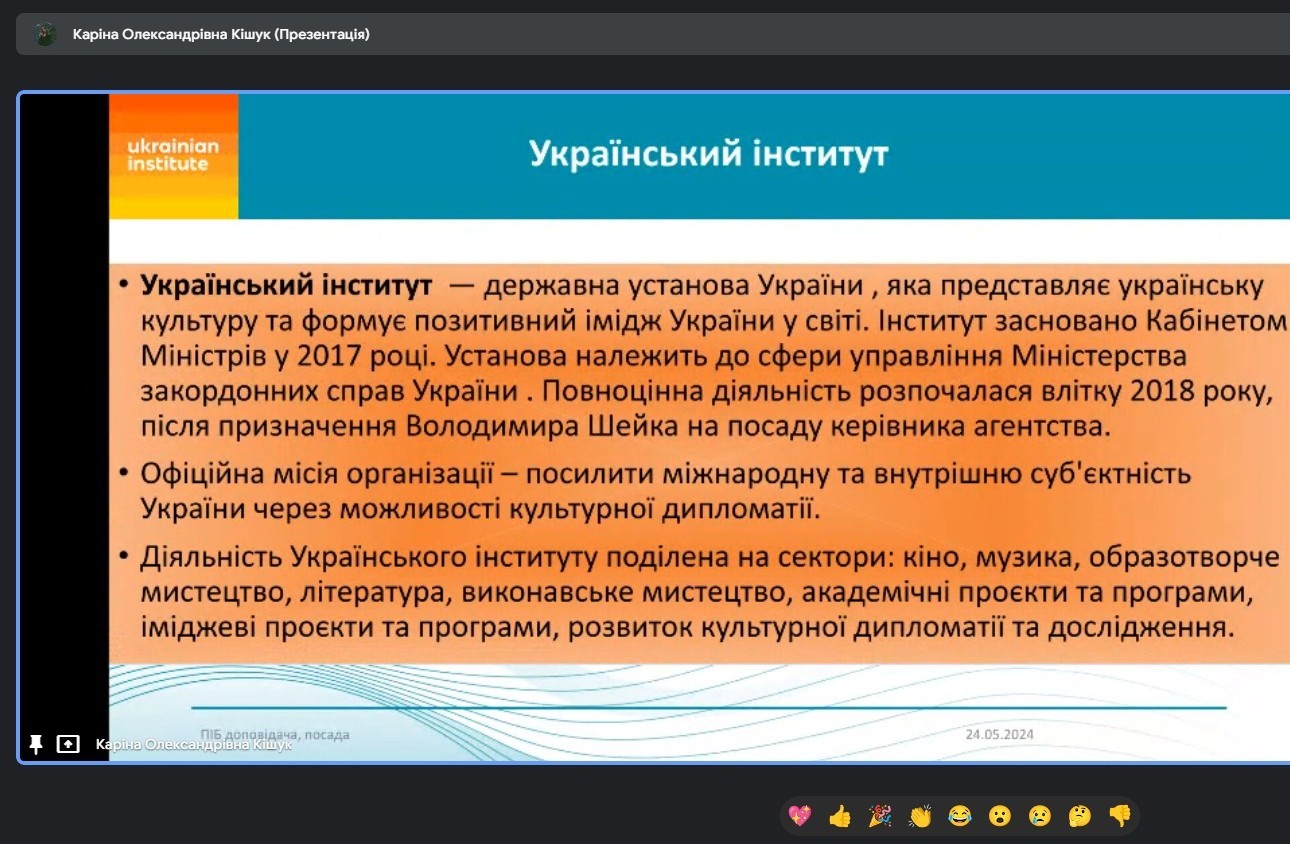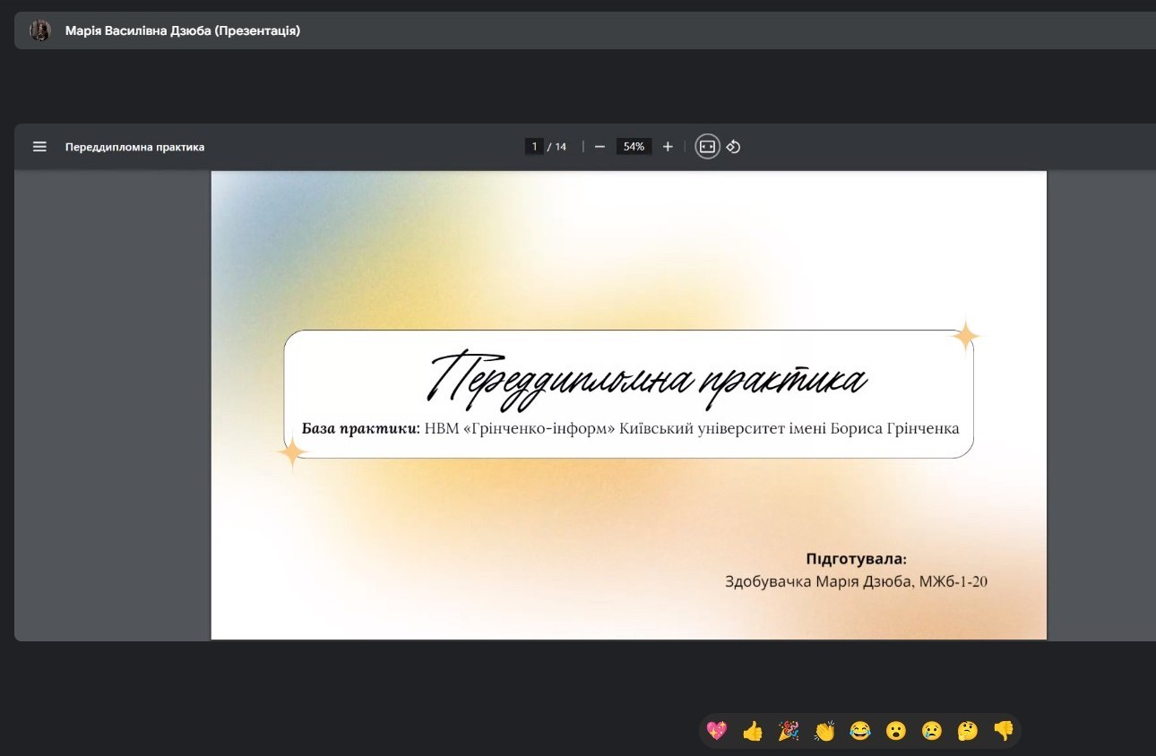 Під час конференції студенти прозвітували про форми роботи та завдання, які вони виконували під час практики в рамках підготовки своїх дипломних проєктів, обговорили компетентності та навички, які отримали при виконанні завдань, розповіли про свої враження від проходження практики.