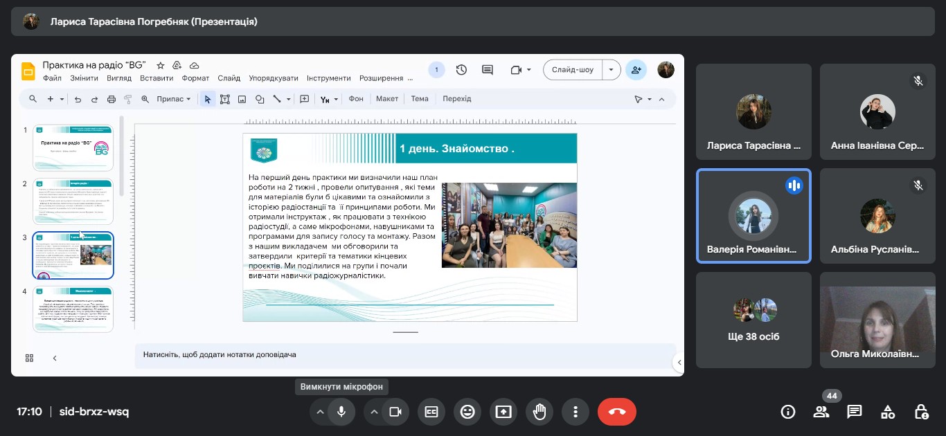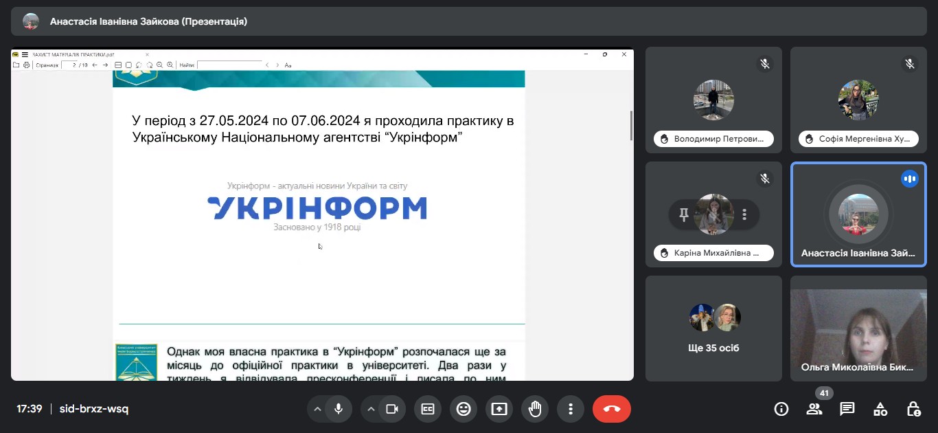 Звітна конференція відбулася на платформі Google Meet за модерування керівника практики від університету доцента кафедри міжнародної журналістики Ольги БИКОВОЇ.
