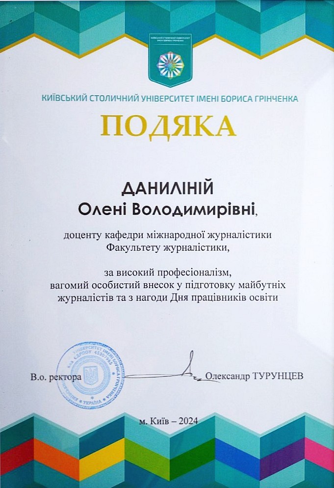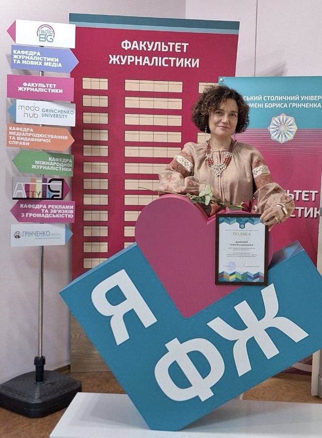 Подяку від Київського столичного університету імені Бориса Грінченка отримала Олена ДАНИЛІНА, доцент кафедри міжнародної журналістики.