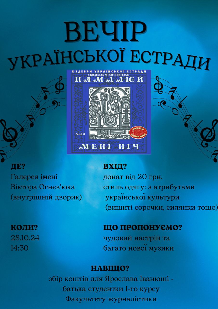 28 жовтня 2024 року до Дня української писемності та мови студенти 1 курсу ОП «Міжнародна журналістика» провели Вечір української естради, згадуючи хіти 1960–70 років. Ініціатором заходу виступила Марина Богуславська, яка розробила сценарій та плакати про відомих митців та їхню творчість.