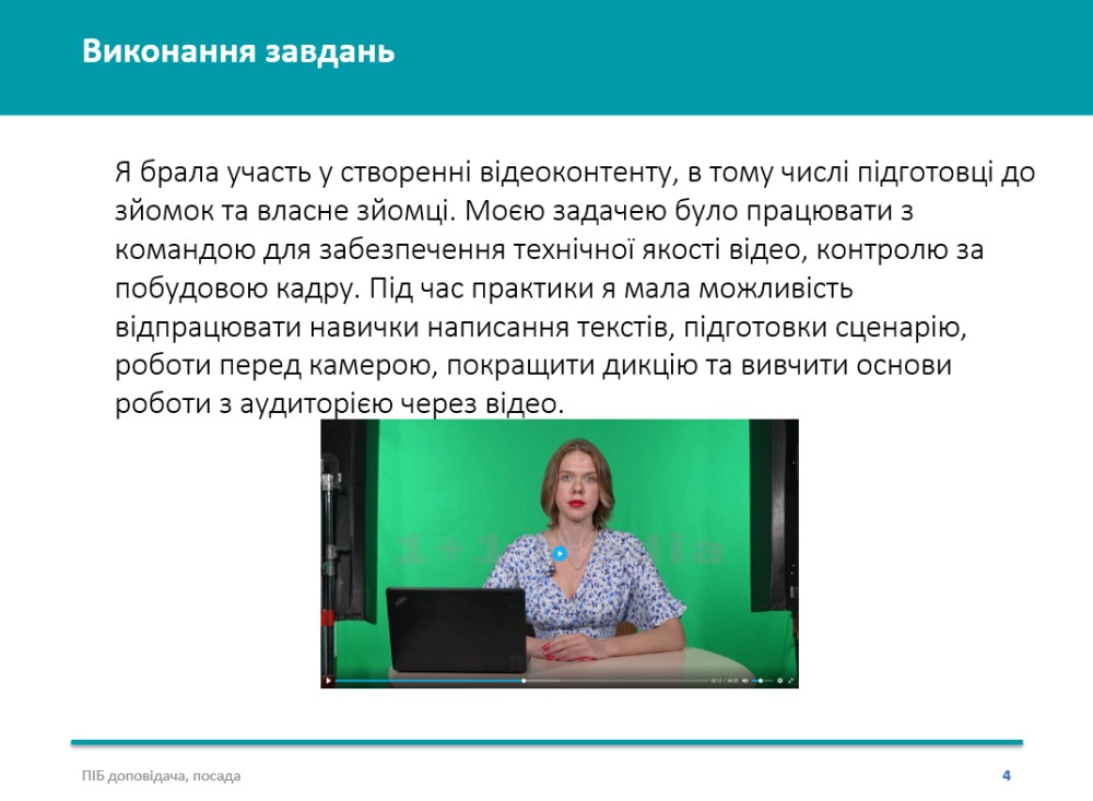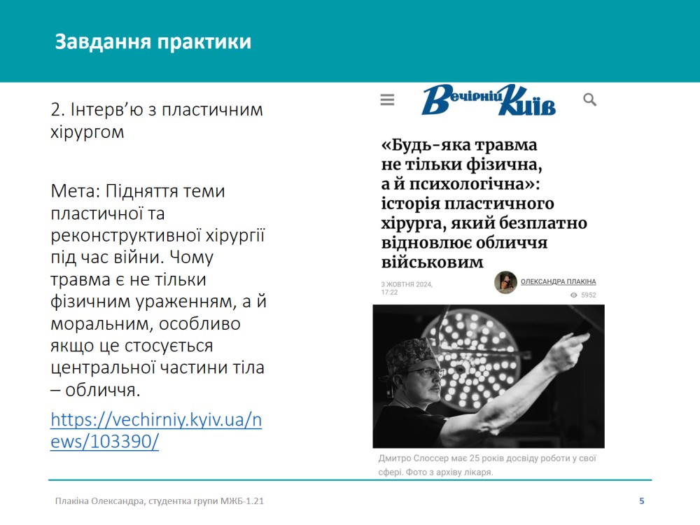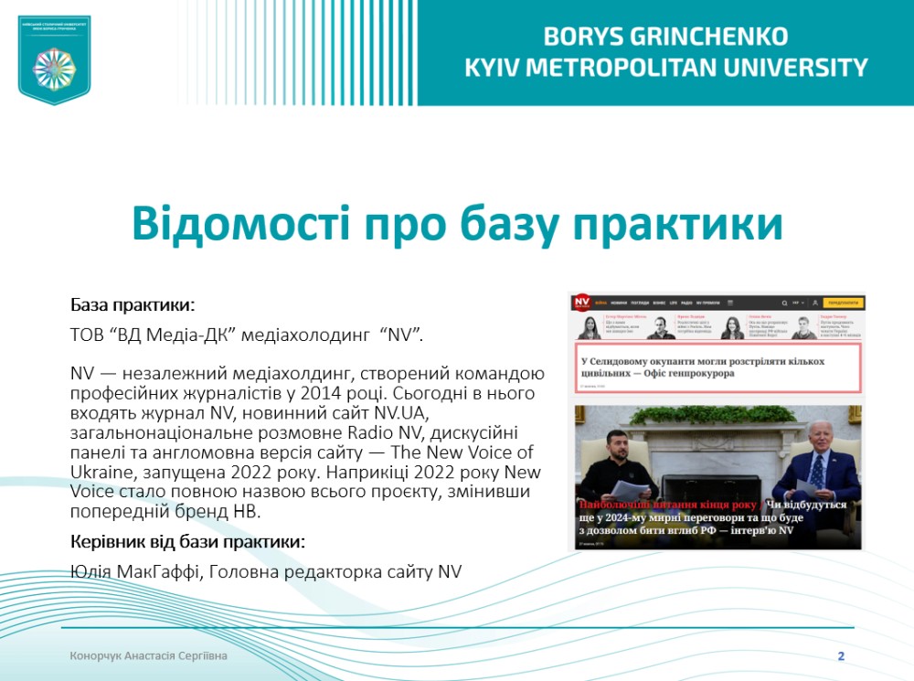 Практика проходила з 2 вересня по 23 жовтня 2024 року на базі таких інституцій, як Міжнародний центр підтримки підприємництва CIPE, Державна установа «Український інститут», пресслужба Національного антикорупційного бюро України, Комунальне підприємство «Київ інформ», ТОВ «1+1 ІНТЕРНЕТ», видання «Kyiv Post», інтернет-медіа «YULA News», медіахолдинг «NV» тощо.