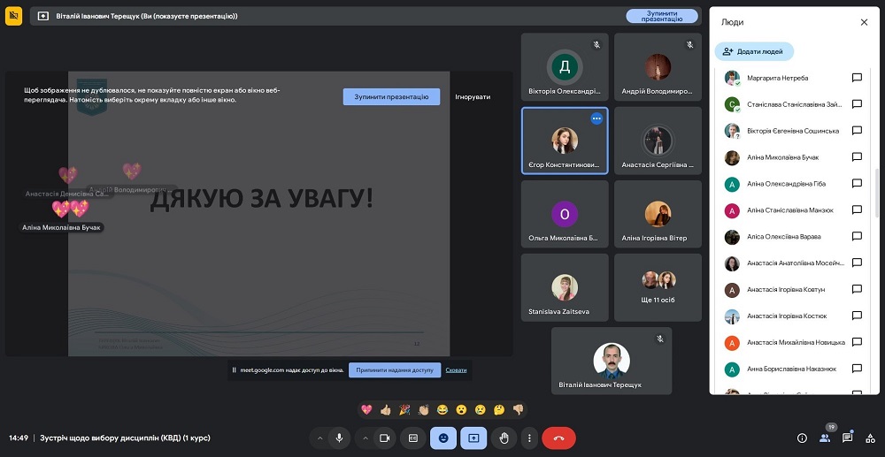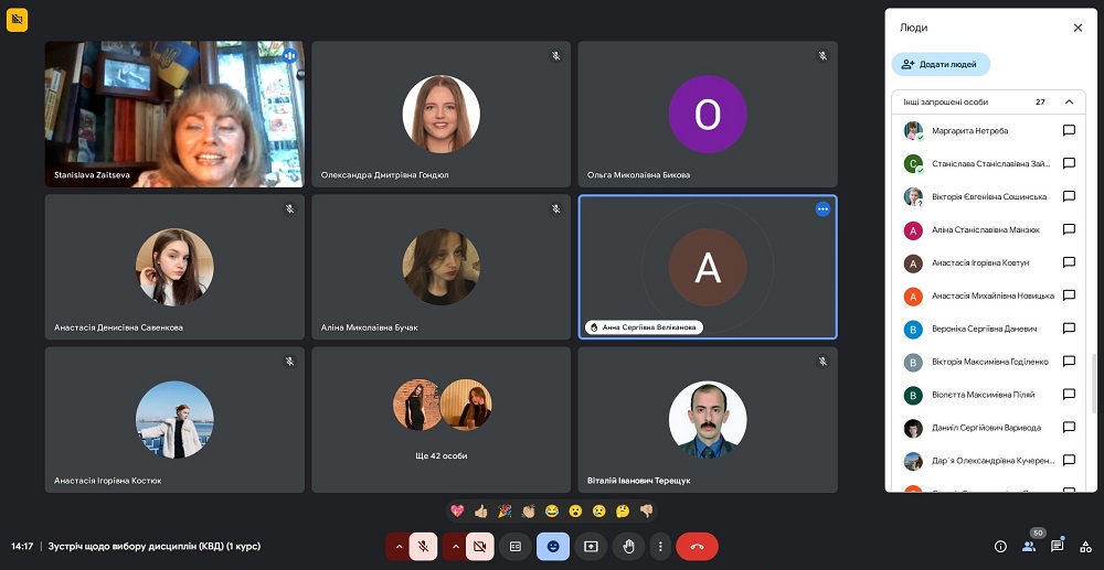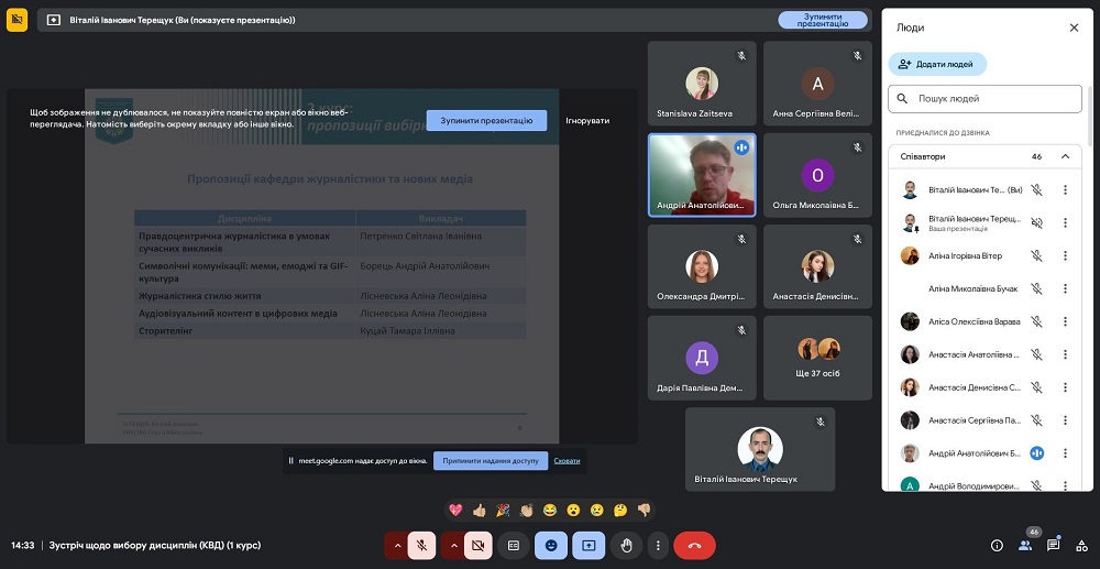 Завідувач кафедри міжнародної журналістики Віталій Терещук та гарант освітньої програми Ольга Бикова розповіли про процедуру вибору та особливості роботи з каталогом вибіркових дисциплін. Після цього викладачі кафедри міжнародної журналістики, кафедри журналістики на нових медіа, кафедри реклами зв’язків з громадськістю, кафедри медіапродюсування та видавничої справи представили свої дисципліни.