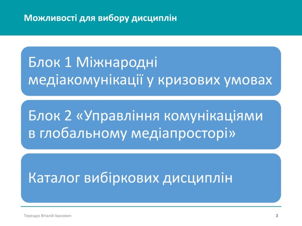 Гарант освітньої програми Віталій Терещук розповів про процедуру вибору і відповів на запитання здобувачів. У зустрічі також взяли участь викладачі кафедри, які представили свої вибіркові дисципліни: професор Олег Семенюк, доцент Олена Даниліна, доцент Анна Скорофатова, викладач Денис Мураховський.
