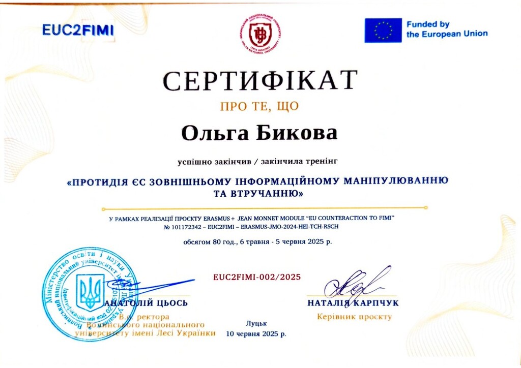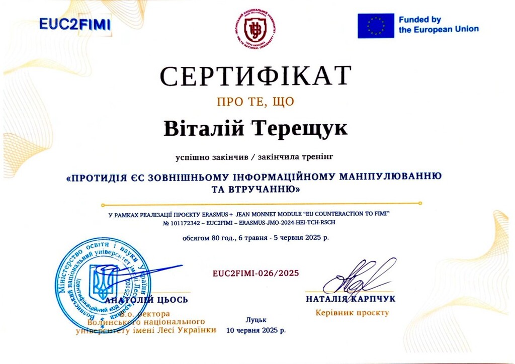 У травні–червні 2025 року співробітники кафедри міжнародної журналістики завідувач Віталій Терещук, доцент Ольга Бикова та викладач Денис Мураховський проходили тренінг «Протидія ЄС зовнішньому інформаційному маніпулюванню та втручанню», проведеному кафедрою міжнародних комунікацій та політичного аналізу Волинського національного університету імені Лесі Українки.