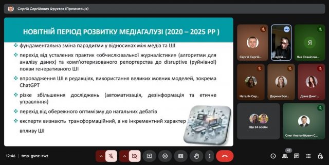 3 листопада 2025 року в межах вивчення навчального курсу «Суспільно-політичні студії: Стратегії розвитку науки» студенти третього курсу спеціальностей «Міжнародна журналістика» та «Журналістика» прослухали лекцію на тему «Сучасні напрямки дослідження ШІ в медіа». В ролі лектора виступив аспірант 3 року навчання ОНП «Журналістика» Сергій Фруктов (науковий керівник – професор Олег Семенюк).