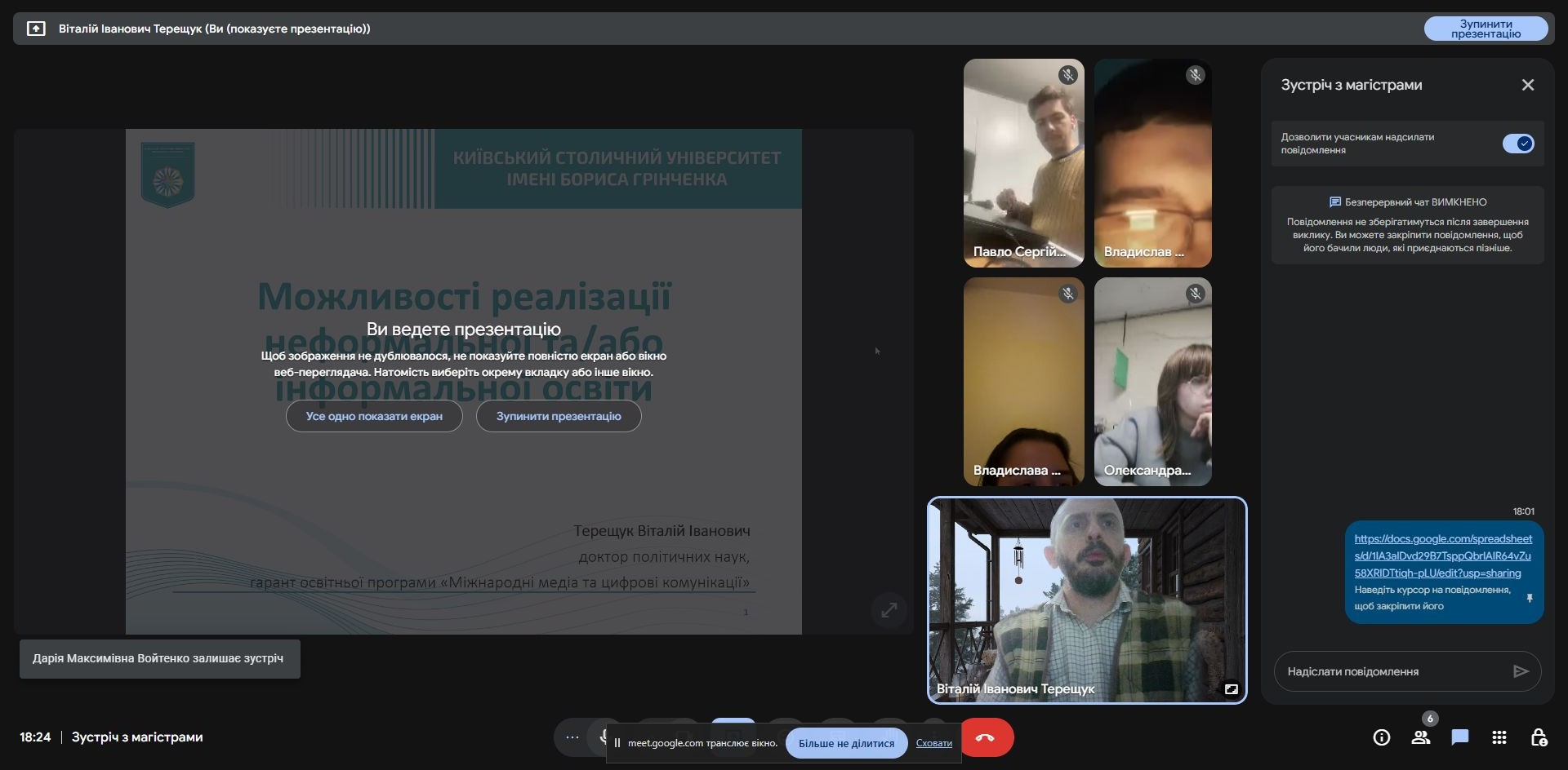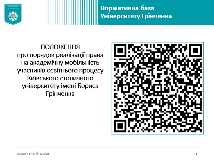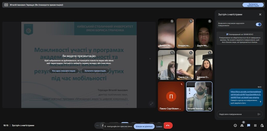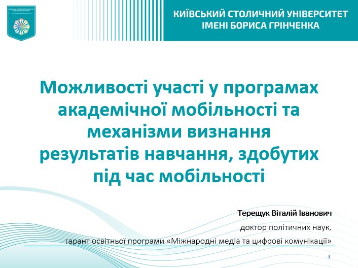 - Можливості участі в очних і дистанційних програмах академічної мобільності та механізми визнання результатів навчання, здобутих під час мобільності. Гарант розповів про процедуру участі в академічній мобільності відповідно до Положення про порядок реалізації права на академічну мобільність учасників освітнього процесу Київського столичного університету імені Бориса Грінченка, окремо зупинився на питанні визнання результатів навчання за програмами академічної мобільності.